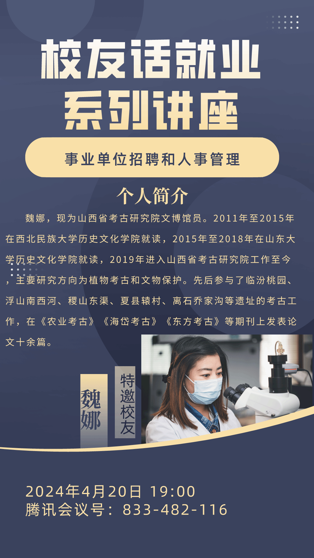 博物馆学专业,2015年经推免到山东大学读研,现就业于山西省考古研究院。在讲座中,她详细介绍了事业单位的招聘流程,包括公告发布、报名、资格审查、笔试、面试、体检、公示等具体环节。 此外,她还分享了人事管理的相关内容,阐述了人事管理的重要性,提醒同学们要注重自身素质的提升,以适应不断变化的工作环境。