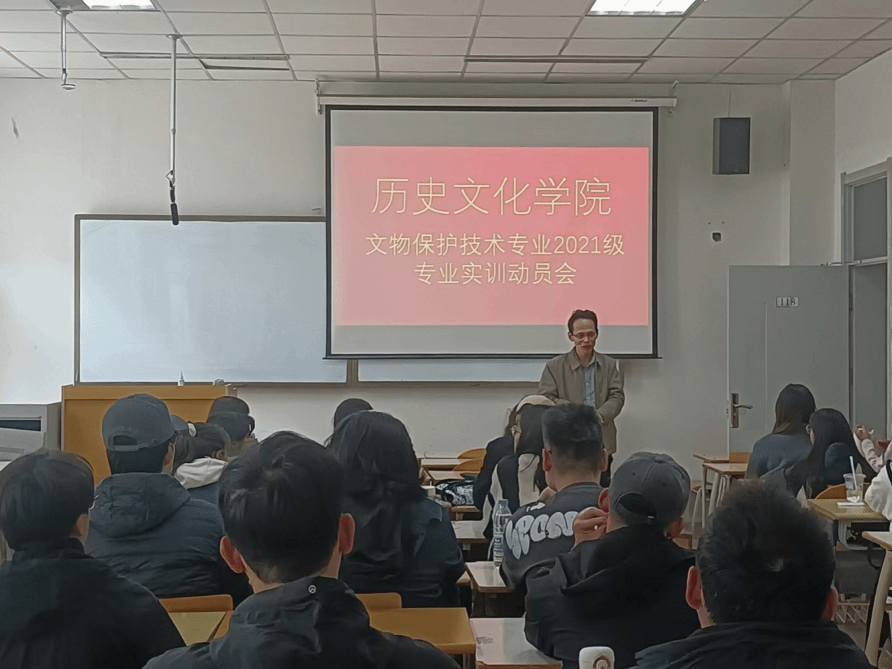 在致善楼118教室召开2021级文物保护技术专业实训动员大会。参加本次专业实训的文物保护技术专业全体师生参加了动员大会。