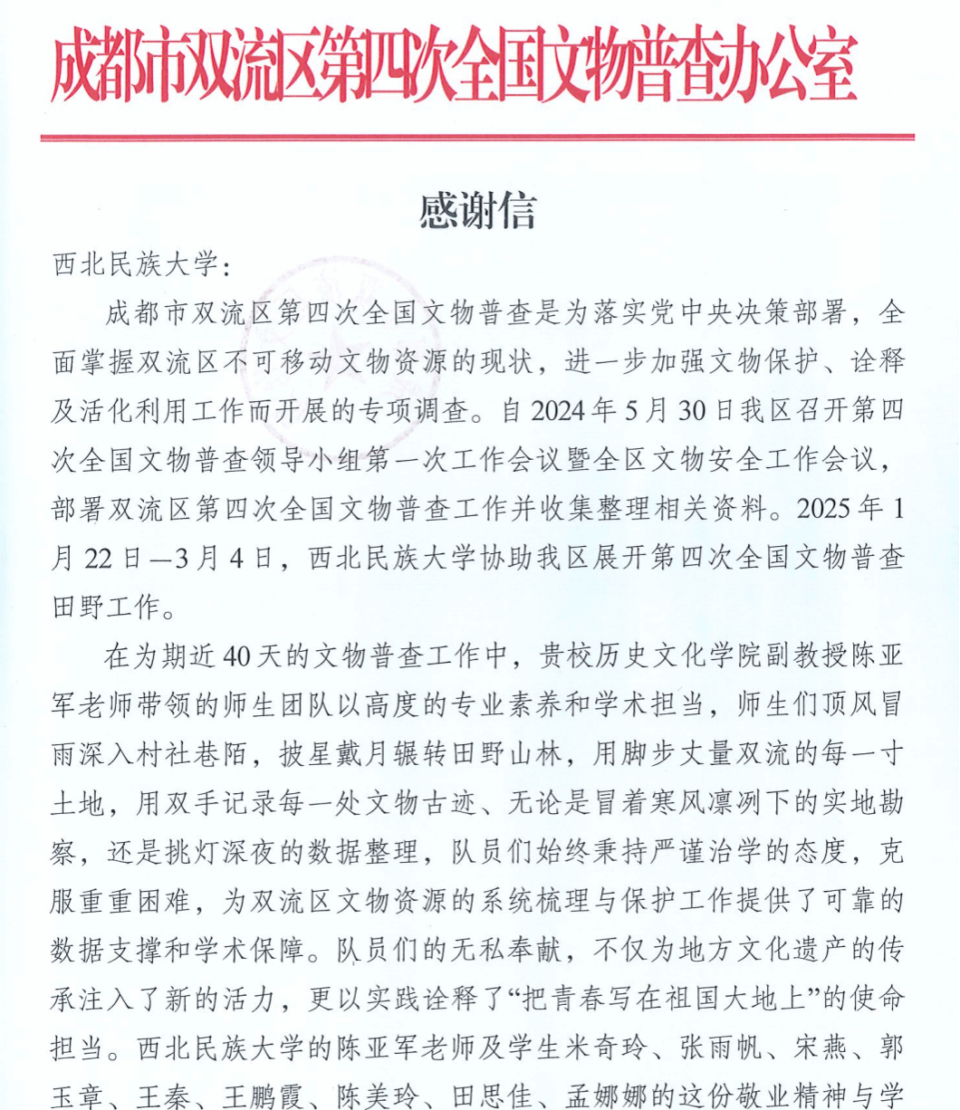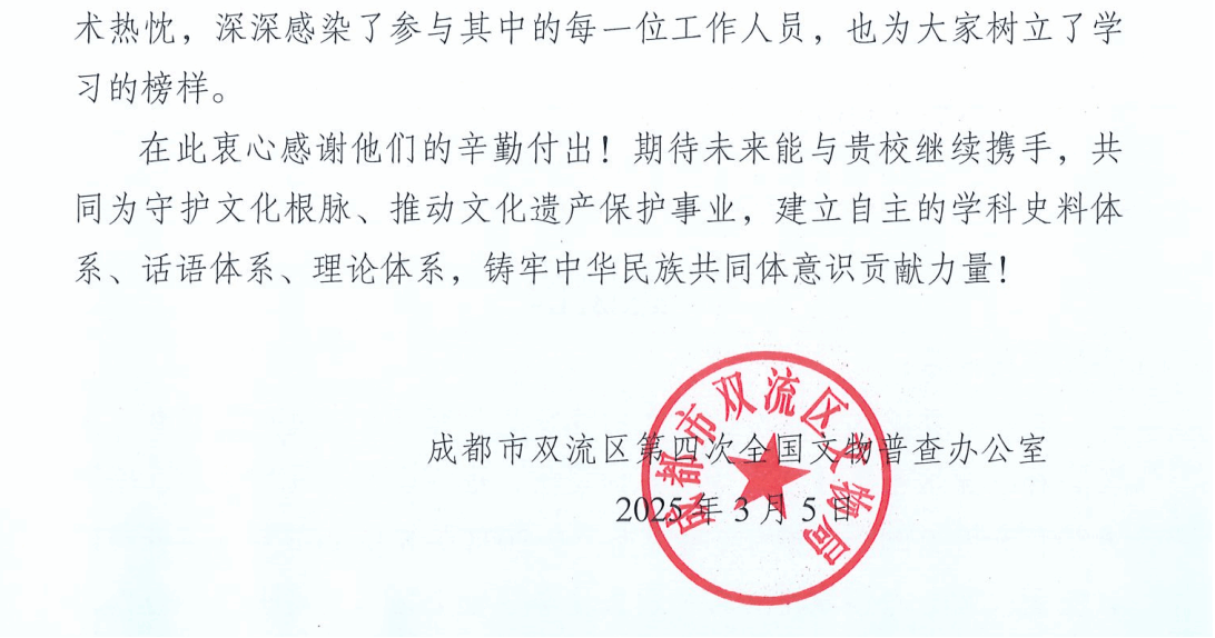 以全国第四次文物普查为契机,与兄弟院校、地方文物单位联合组成普查工作队,在协力推进了成都市文物普查工作的同时,为摸清文物家底、赓续历史文脉,抒写了时代华章。