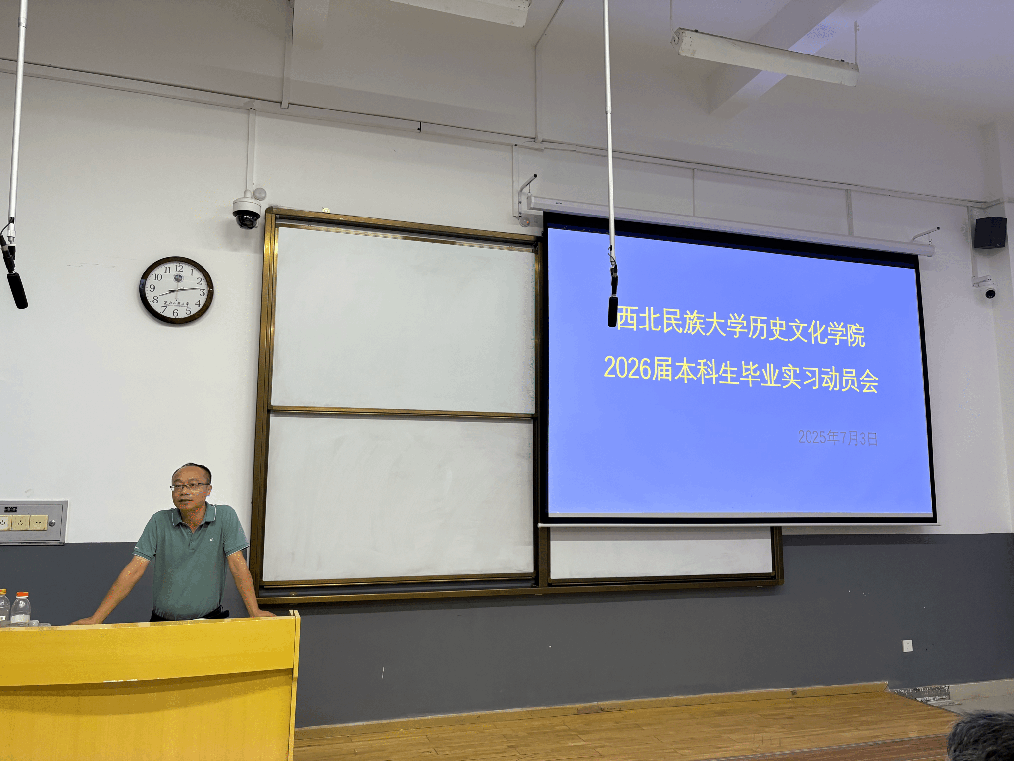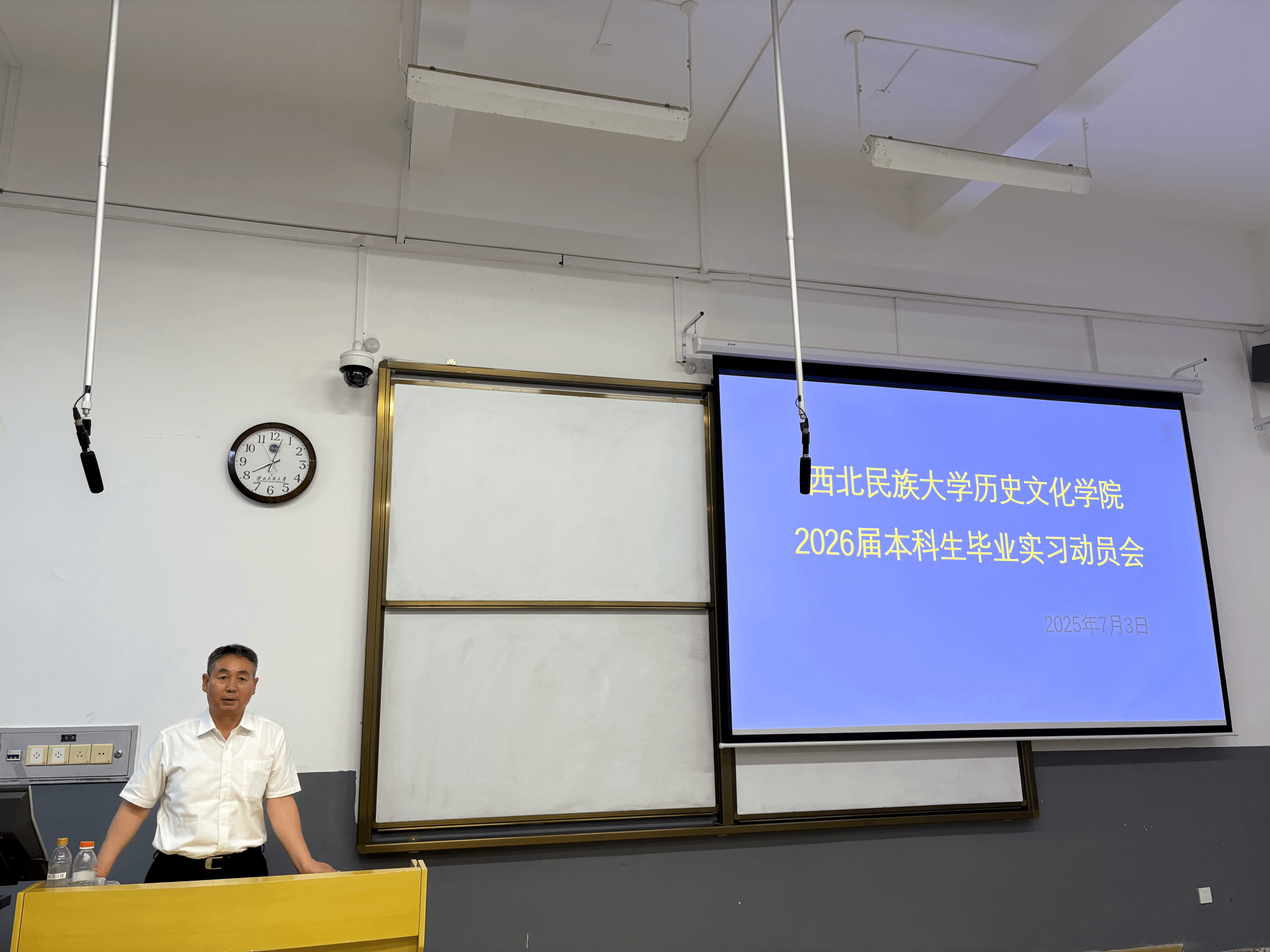 2026届本科生毕业实习动员会在榆中校区致真楼105教室召开。为即将踏上实习征程的历史学、文物与博物馆学、文物保护技术专业2022级全体本科学生指明方向、明确要求、筑牢安全底线。院长杨永锋、党委副书记王振忠、科研副院长吴通、教学副院长赵光国及全体实习指导教师出席会议。