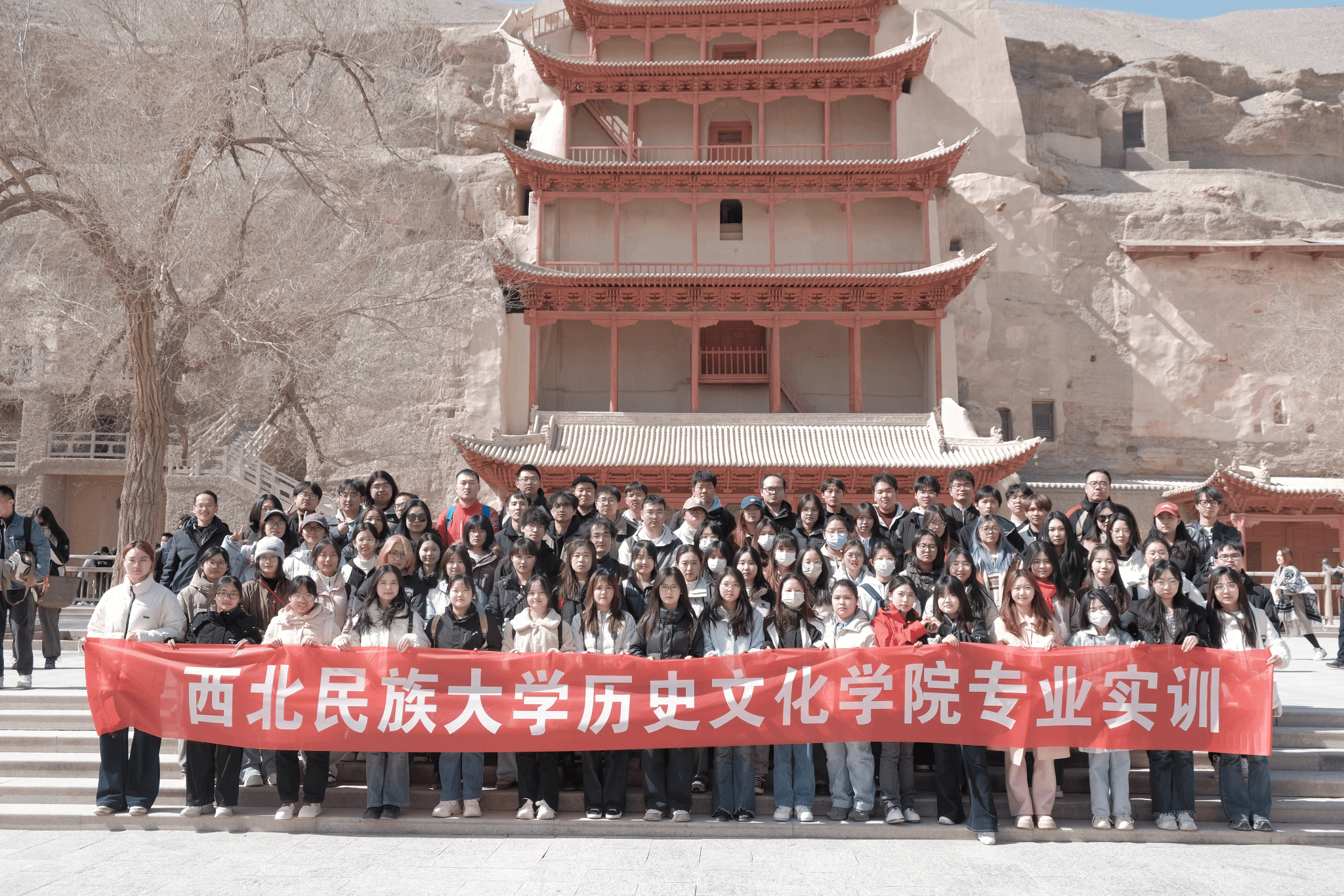 历史学专业85名本科生赴敦煌开展专业实训。通过莫高窟、阳关、玉门关、悬泉置、榆林窟等6处历史文化遗址和博物馆的沉浸式教学,构建起"数字呈现-遗址考察-专题解析"三维教学体系。