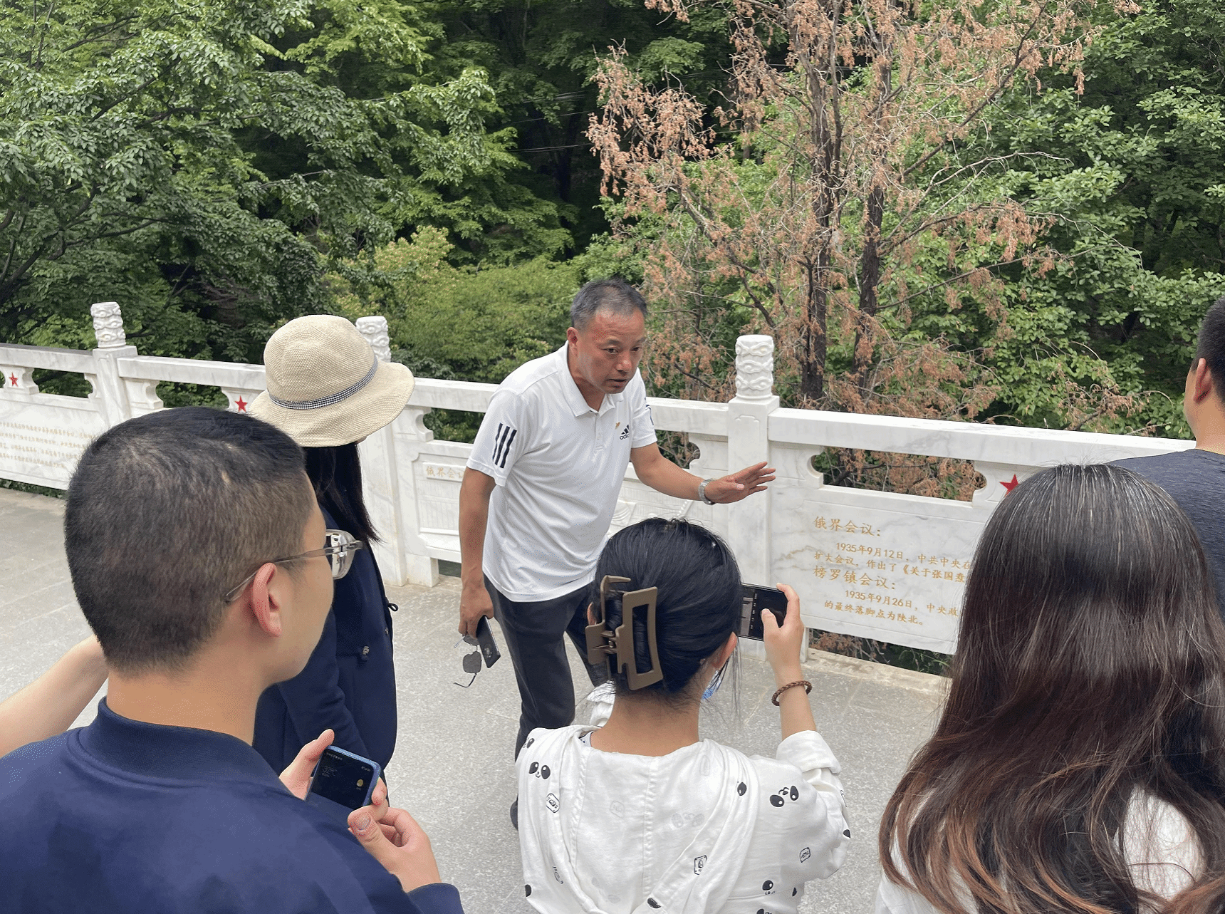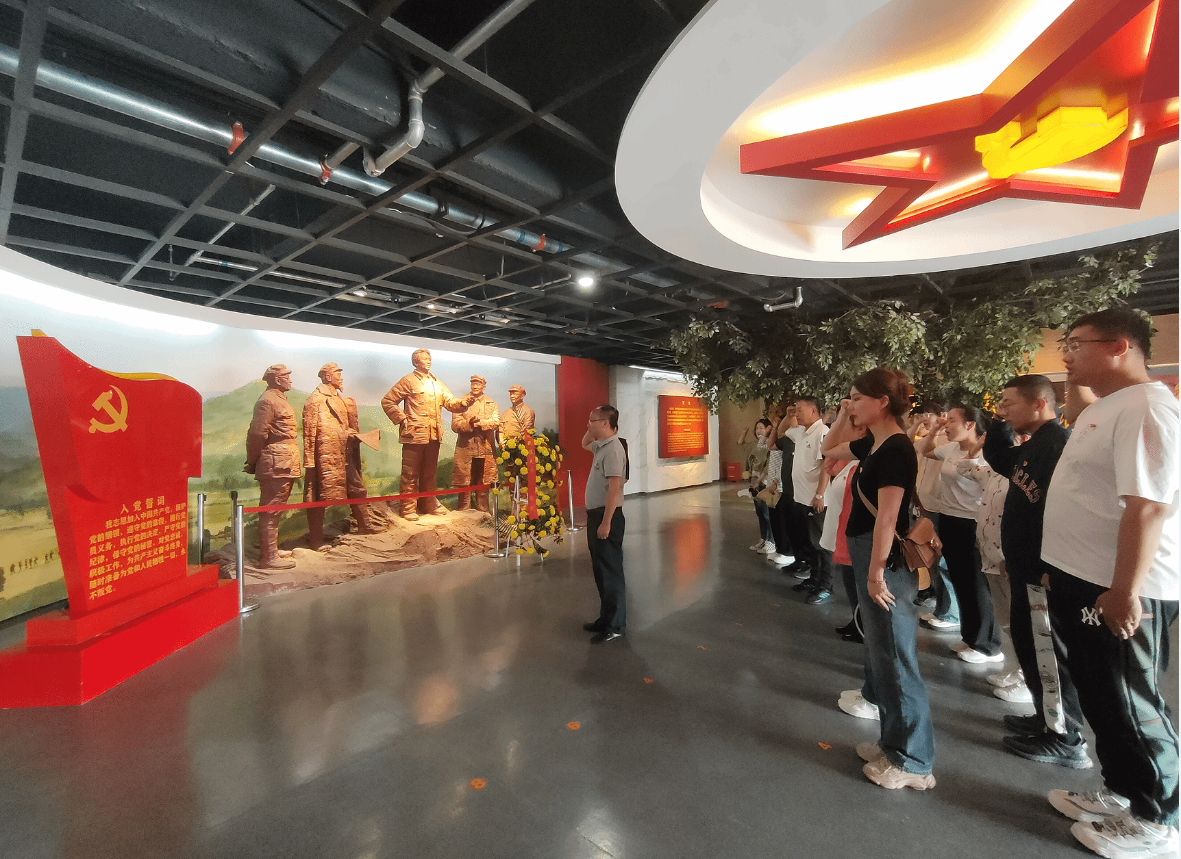 张纬老师、杨永锋老师敬献花篮并整理缎带,随后由杨永锋老师领誓,全体党员掷地有声地重温了入党誓词。伴随着纪念馆讲解员声情并茂的讲解和馆内详实的史料,全体党员一边聆听老一辈无产阶级革命家浴血奋战的英雄事迹,一边仔细瞻仰馆内的历史图片资料和实物展品,共同重温了红军波澜壮阔、艰苦卓绝的长征历程,回顾了以毛泽东主席为核心的党的第一代中央领导集体为党和人民事业取得的每一个重大胜利付出了巨大心血,作出了卓越贡献,更加深化了对于长征精神的理解。参观完毕后,全体党员来到纪念碑处瞻仰,正午的阳关照射在雄伟的纪念碑之上,泛起阵阵金光,仿佛在无声地诉说着这段光荣的岁月。