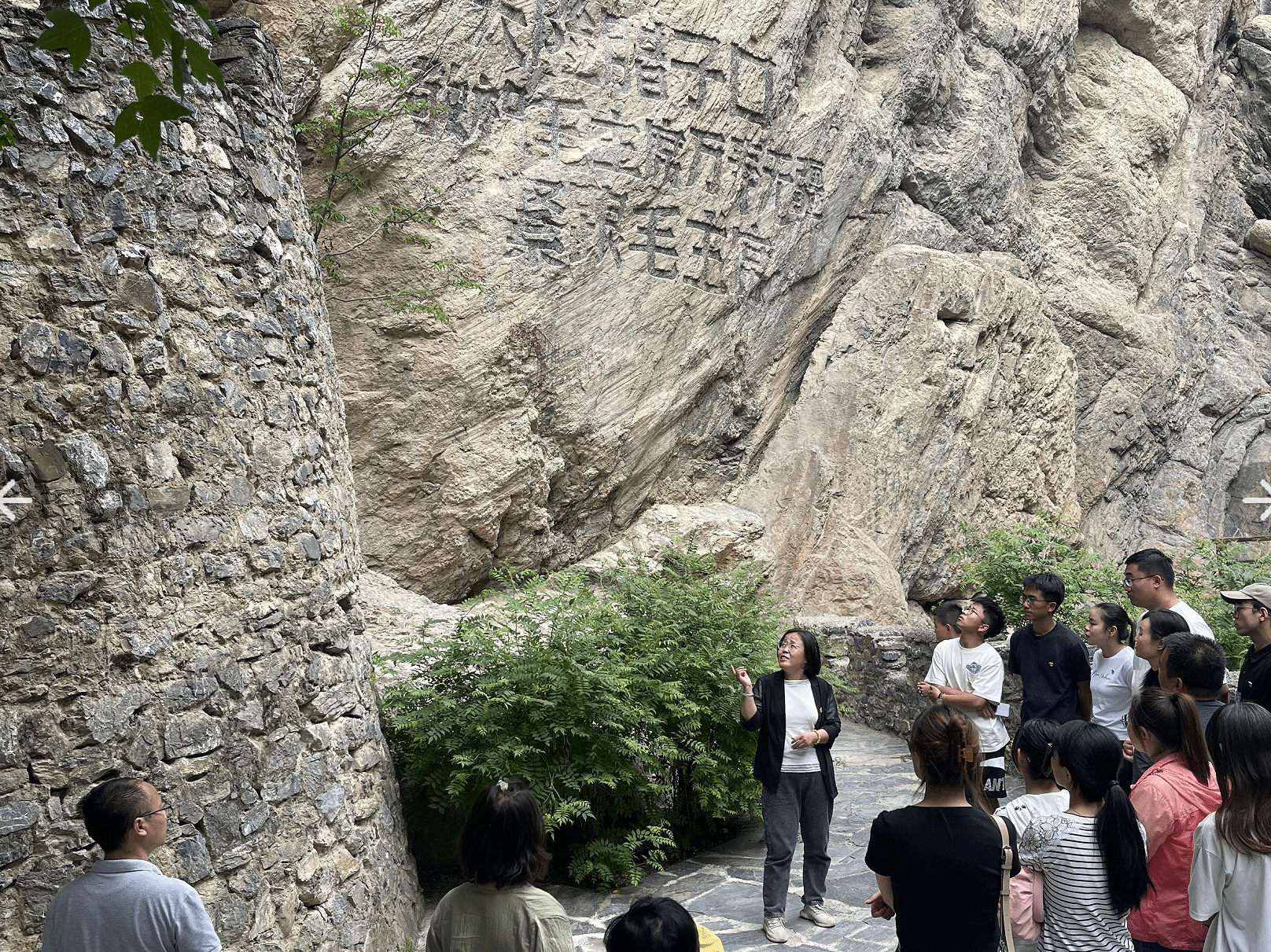 腊子口是四川通往甘肃的必经之路。1935年长征途中,面对前堵后围的困境,红军战士们历经艰险,最终夺取腊子口,打开了长征北上的通道。全体党员来到腊子口纪念碑处置身其中地感受红军取得腊子口战役胜利的艰难与不易,愿牺牲在此的红军战士英魂长存、精神常驻。大家沿着石刻长廊缓缓而行,夏春峰老师围绕红军长征的重要节点,两河口会议、俄界会议等,边走边讲,为全体党员生动地梳理了红军来到哈达铺、腊子口的长征历程,重温了革命先辈一往无前、决战决胜的坚定信念和崇高精神。当走到一处碉堡时,王桂莲老师为大家详细地讲述了“云贵川”小战士舍身炸碉堡的事际,并结合夺取腊子口战役胜利的过程,为全体党员上了一节详实、鲜活的党课。
