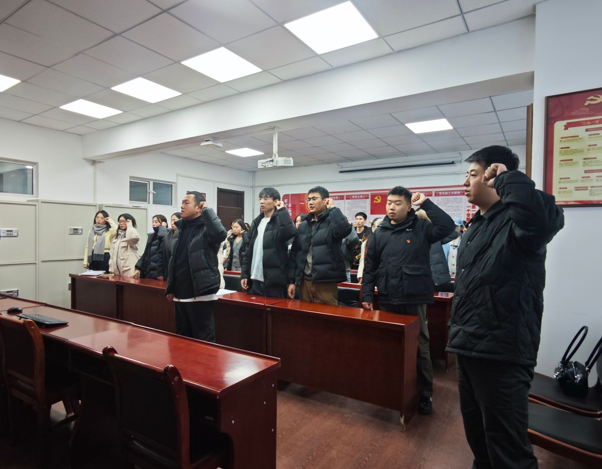 仪式在激昂的《国际歌》声中拉开帷幕,全场人员庄严肃立,歌声激昂,每一个音符都仿佛在诉说着党的光辉历程与伟大使命。随后,党员们在领誓人的带领下,整齐列队,面向鲜艳的党旗,举起右拳,郑重宣誓:“我志愿加入中国共产党,拥护党的纲领,遵守党的章程……”坚定的誓言在会议室内回荡,彰显着他们对党的无限忠诚和为共产主义事业奋斗终身的决心。