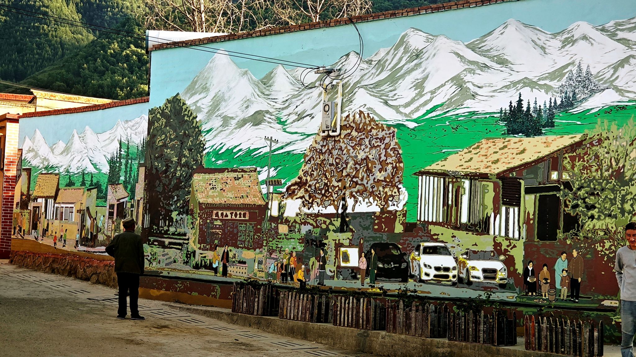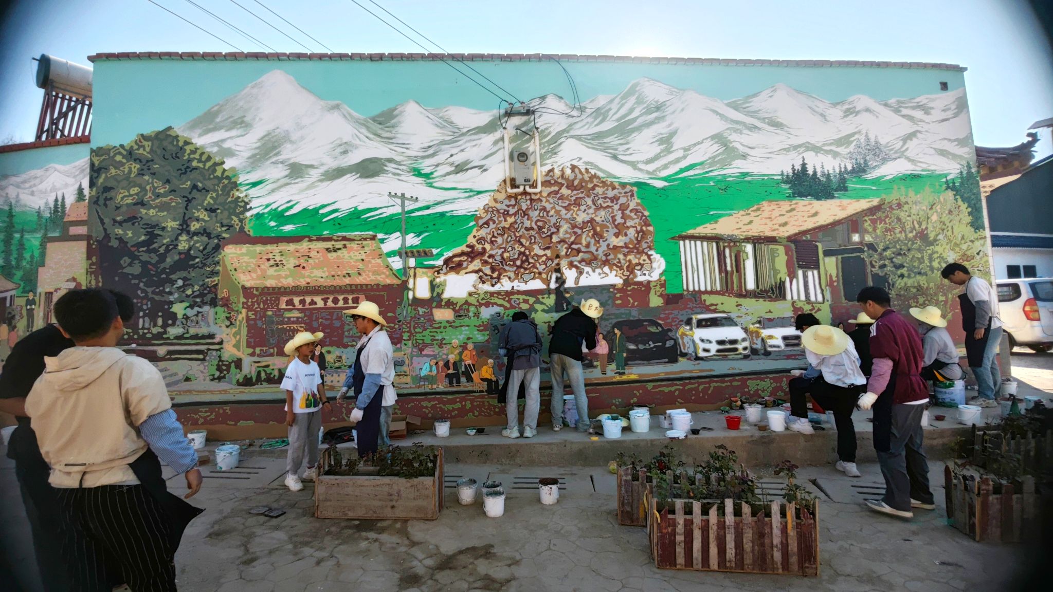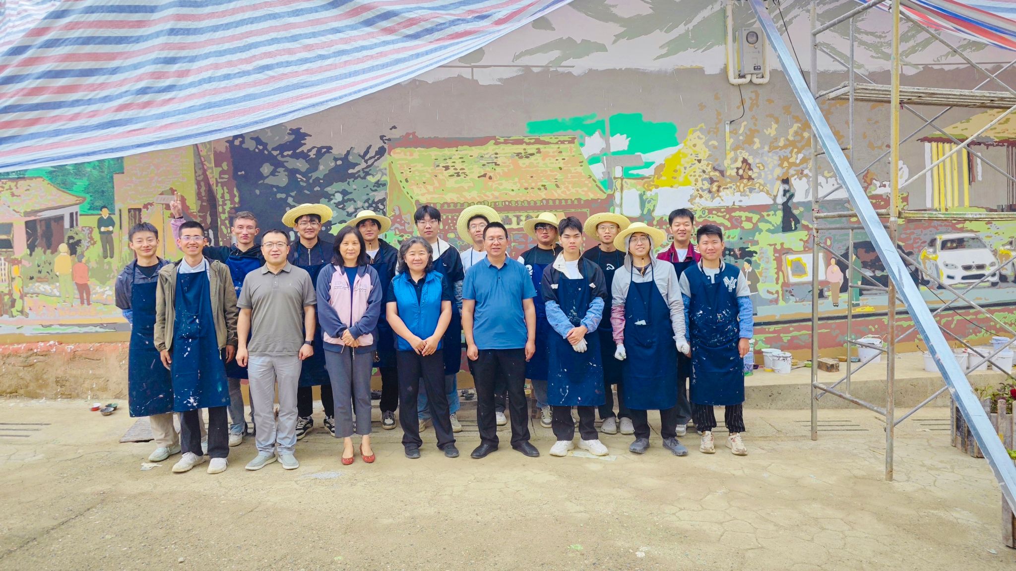 6月初,施工全面铺开。师生们顶着烈日、踏着晨露,以丙烯为墨、以墙面为纸,将灰白的乡村墙壁转化为流淌的艺术长廊:《屋顶交响》——层叠单坡屋顶跃然墙面,再现农耕文明智慧;《守望》——邻里互助、孝老爱亲场景,彰显淳朴乡风;《麦浪山花》——本土生态意象铺陈宜居诗画。墙绘甫一亮相,即吸引村民驻足欣赏、拍照留念,被誉为“家门口的露天美术馆”。