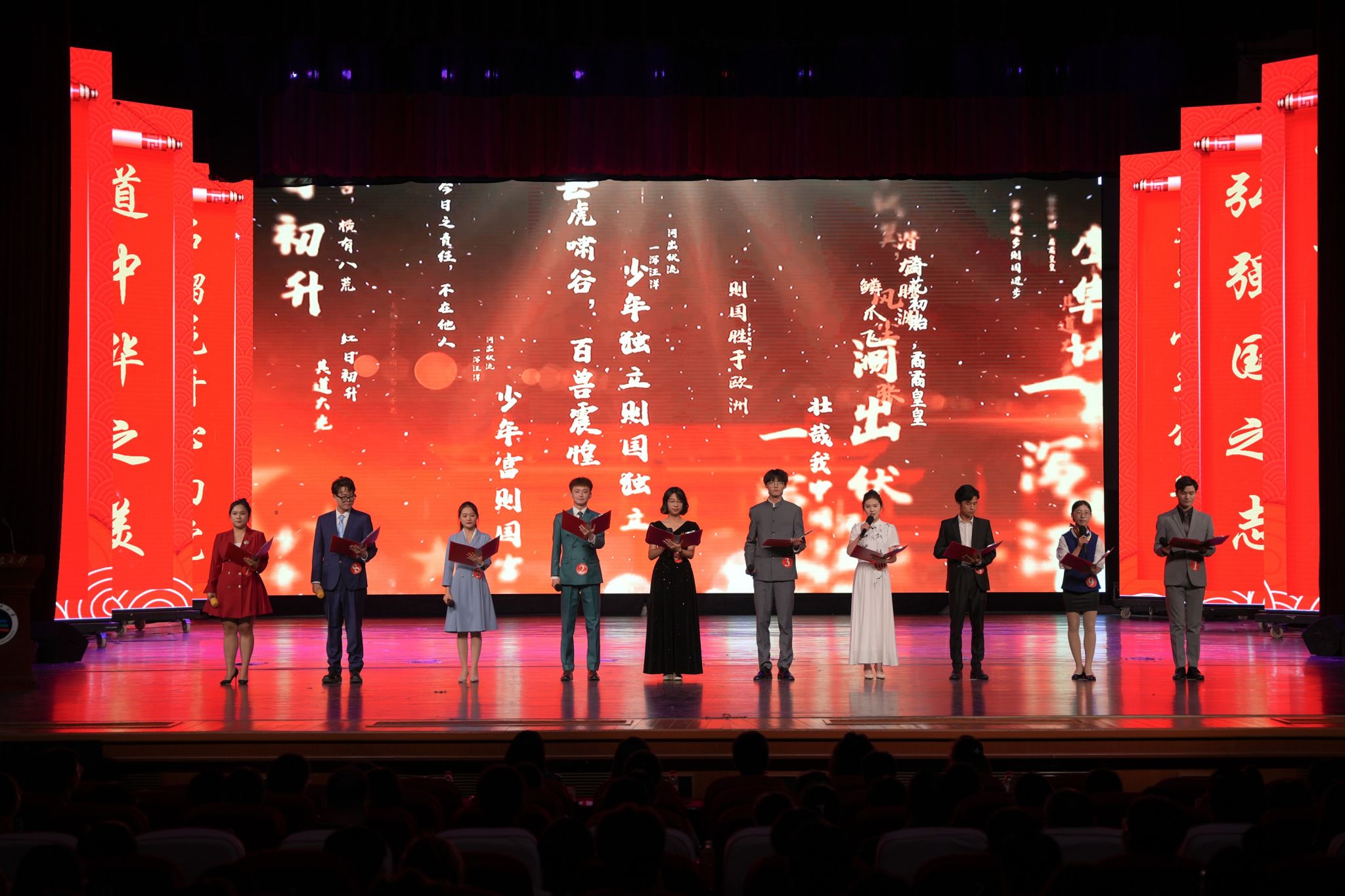 比赛在集体朗诵《少年中国说》中拉开序幕,10名大学生选手豪情满怀、慷慨激昂,用真诚的语调、昂扬的激情、温婉的情愫讴歌了党的丰功伟绩,表达了当代青年学生爱党爱国之情。
