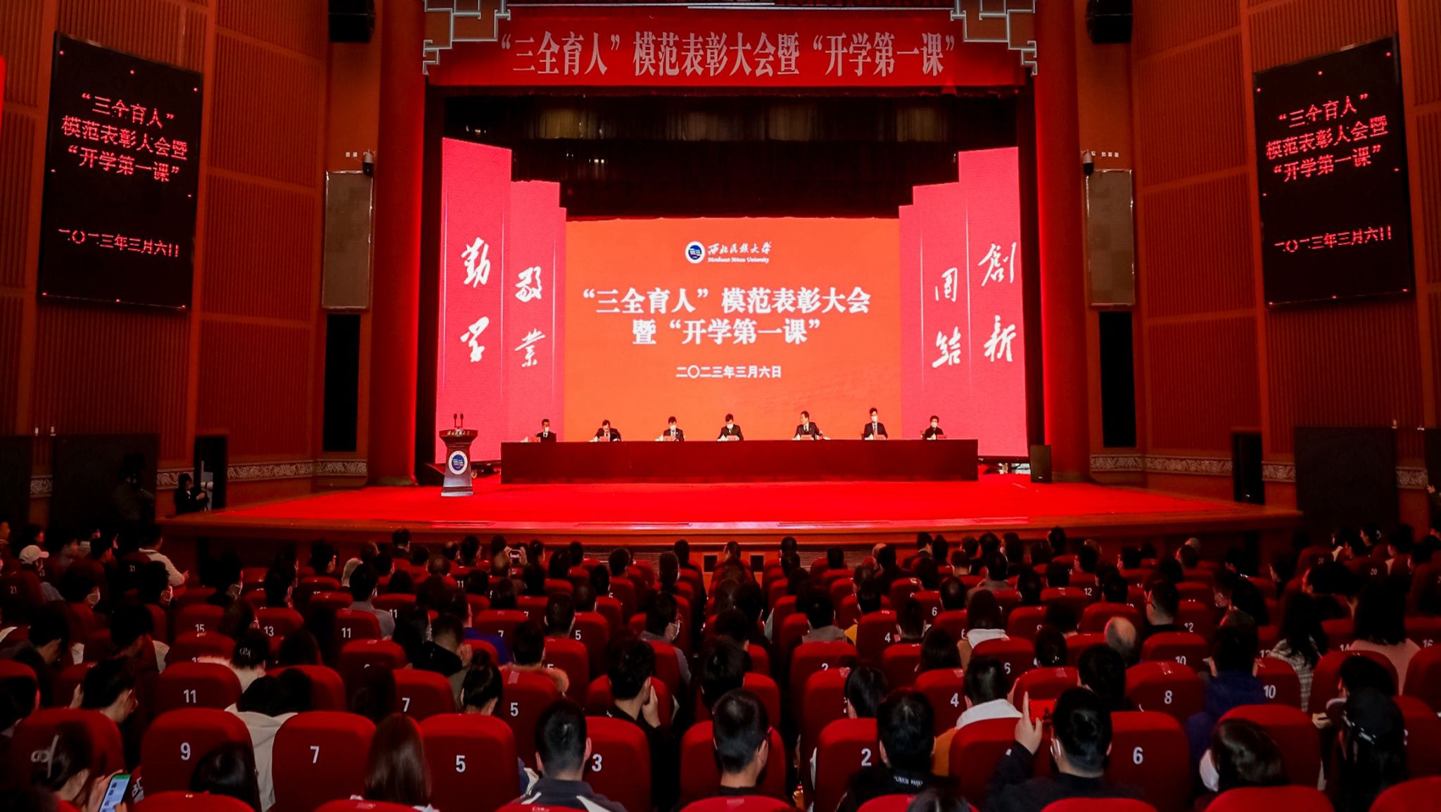 在西北新村校区大礼堂隆重举行“三全育人”表彰大会暨“开学第一课”,全体在家校领导、各职能部门负责人、教学单位负责人、教师和学生代表约700人参加大会。