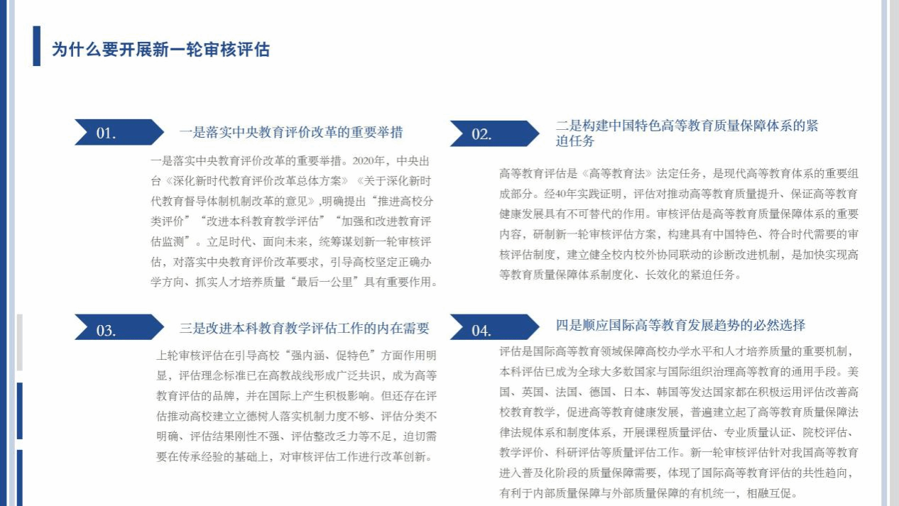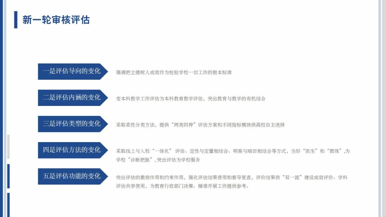 本科教育教学审核评估实施方案(2021—2025年)》(以 下简称《方案》),启动了新一轮审核评估。新一轮审核评估贯彻落实习近平总书记关于教育的重要论述和全国教育大会精神,全面对接新时代教育评价、教育督导体制机制改革要求,引导督促高校遵循高 等教育规律和本科人才培养规律,聚焦本科教育教学质量全面提升。