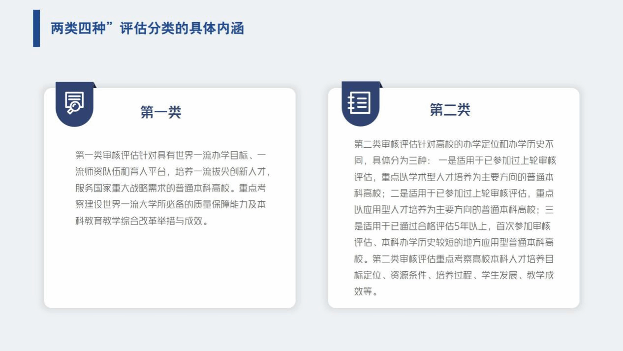 第二类审核评估针对高校的办学定位和办学历史不同,具体分为三种: 一是适用于已参加过上轮审核评估,重点以学术型人才培养为主要方向的普通本科高校;二是适用于已参加过上轮审核评估,重点以应用型人才培养为主要方向的普通本科高校;三是适用于已通过合格评估5年以上,首次参加审核评估、本科办学历史较短的地方应用型普通本科高校。第二类审核评估重点考察高校本科人才培养目标定位、资源条件、培养过程、学生发展、教学成效等。