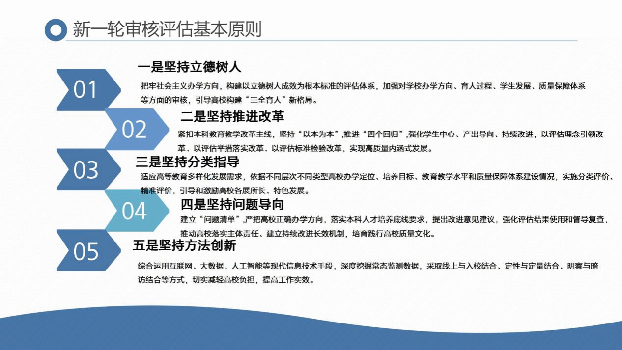 答:新一轮审核评估工作遵循以下五条基本原则。
