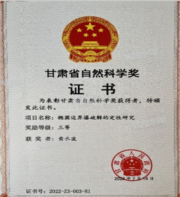 黄水波教授作为第一完成人的科研成果《椭圆边界爆破解的定性研究》获2022年度甘肃省自然科学奖三等奖。