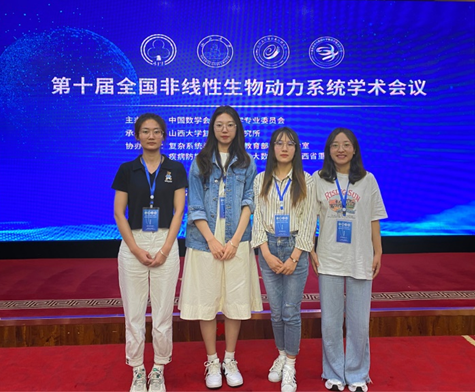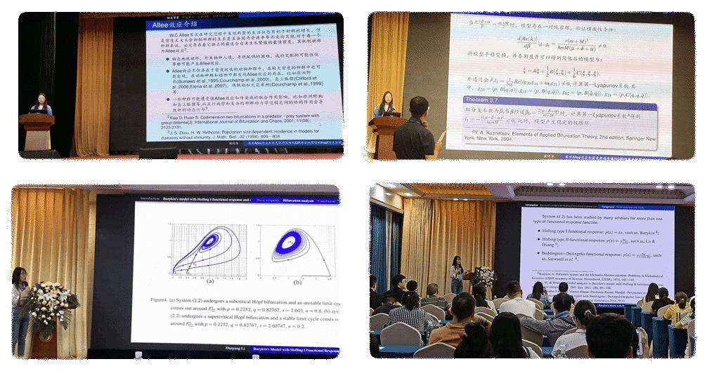 数学专业研究生李丹阳、蔺晓芬、朱鑫杰和卓尕吉参加了此次会议。其中,蔺晓芬和李丹阳分别作了题为《Stability and Hopf bifurcation of an SIR epidemic model with density-dependent transmission and Allee effect》和《Stability and bifurcation analysis of Bazykin’s model with Holling I functional response and Allee effect》的报告。通过此次会议学习,使她们了解了领域前沿思想、启发了科研思路、促进了同行之间的分享与交流,收获颇丰。