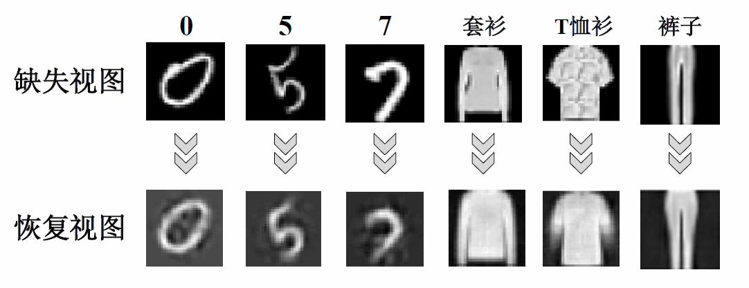 为验证方法在实际应用中的有效性,论文在多个基准数据集上进行了聚类、人体行为识别等任务,并展示了缺失视图恢复的可视化结果,进一步说明该方法具有推断缺失视图信息的能力。图2展示了不完整数据的恢复结果。