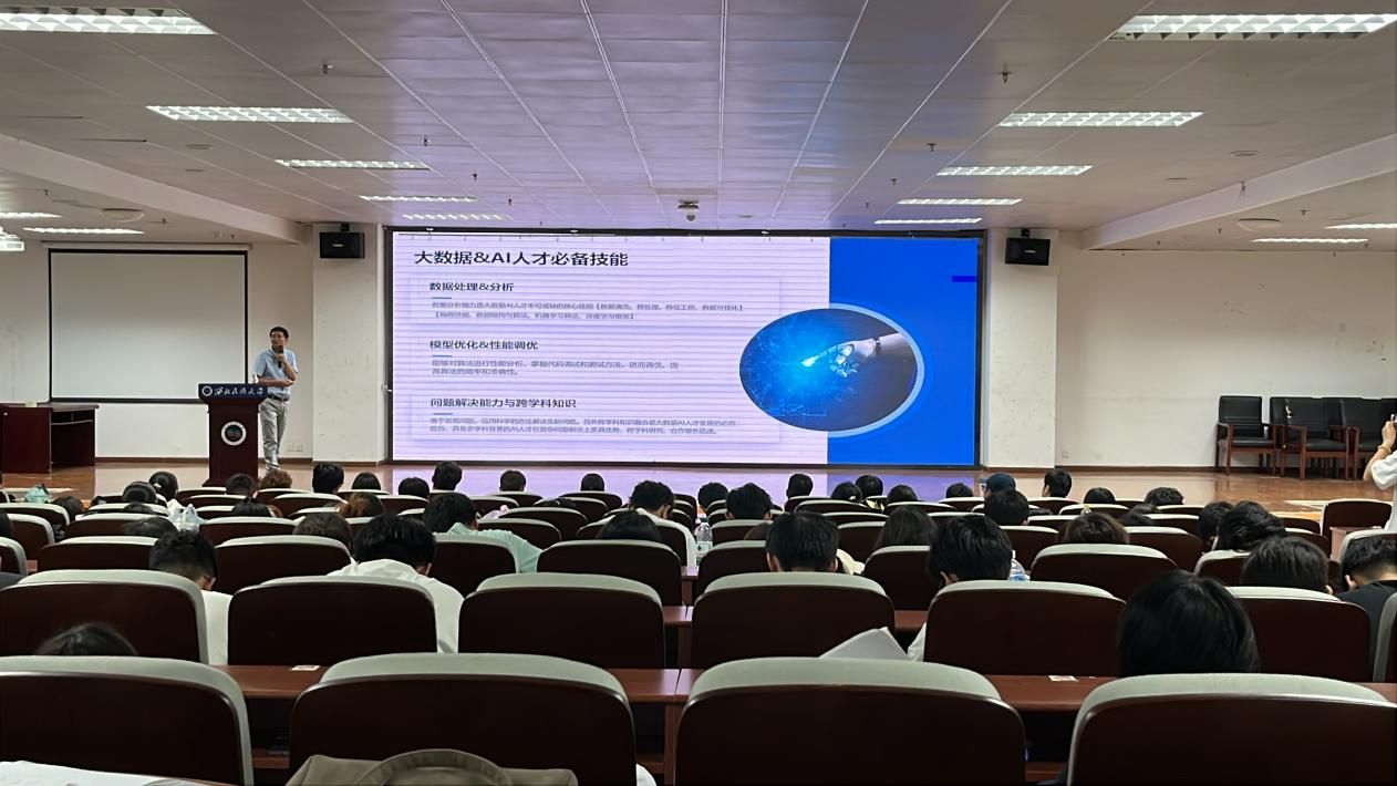讲座伊始,邓明旺校友深入剖析了数据科学与人工智能领域的最新动态和未来趋势。不仅为同学们介绍了自己在数据科学与人工智能领域的创新实践,还详细阐述了数据挖掘、机器学习、自然语言处理等方面的实际应用。他强调,数据科学与人工智能的跨学科融合是未来发展的重要方向,并鼓励在校学生积极投身这一领域,为国家的科技进步和社会发展贡献力量。