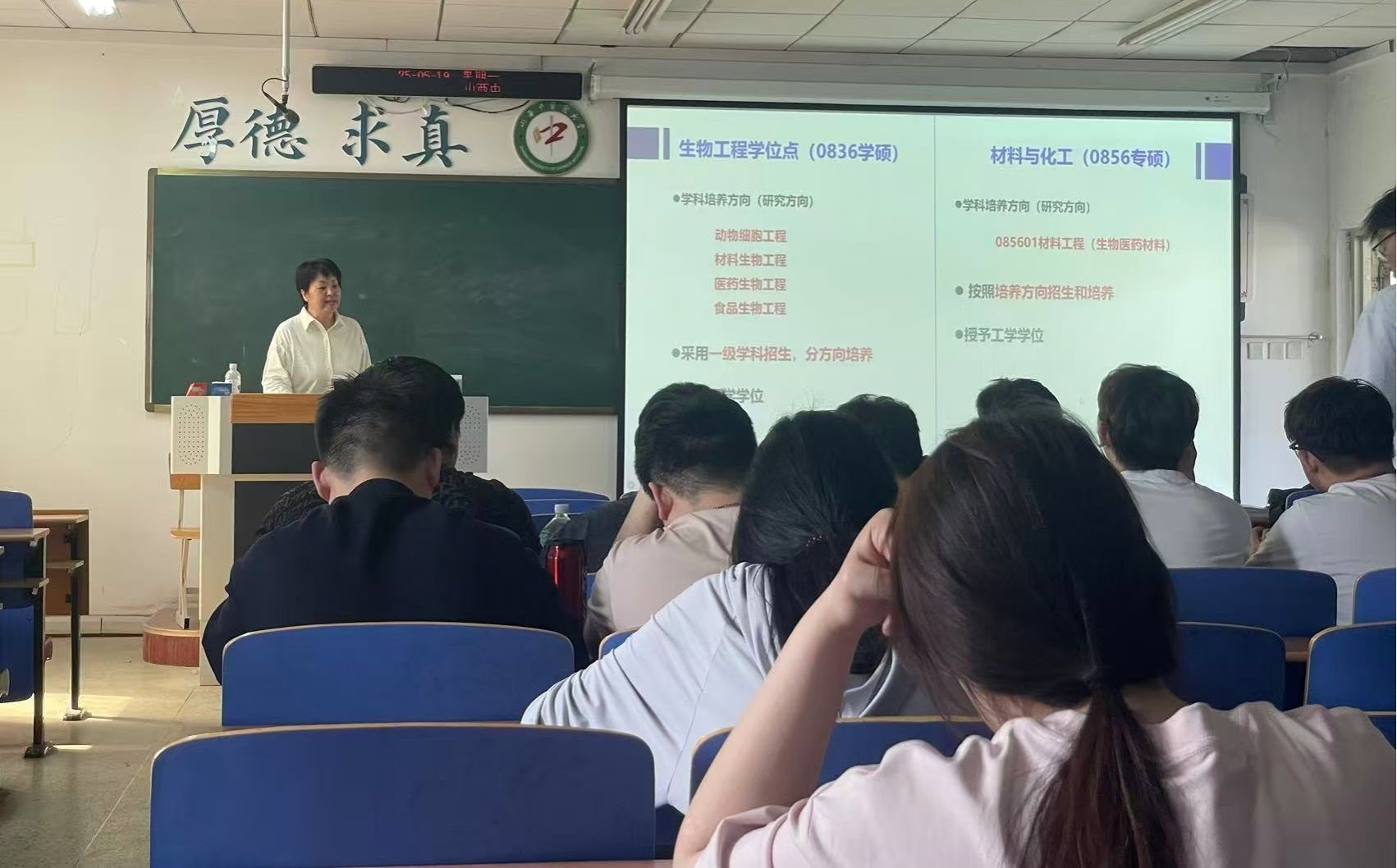 宣讲团介绍了生物工程学科科研团队、科研平台、代表性研究成果和人才培养措施及成效,重点介绍了生物工程一级学科学术型硕士和材料与化工专业型硕士学位点招生政策。