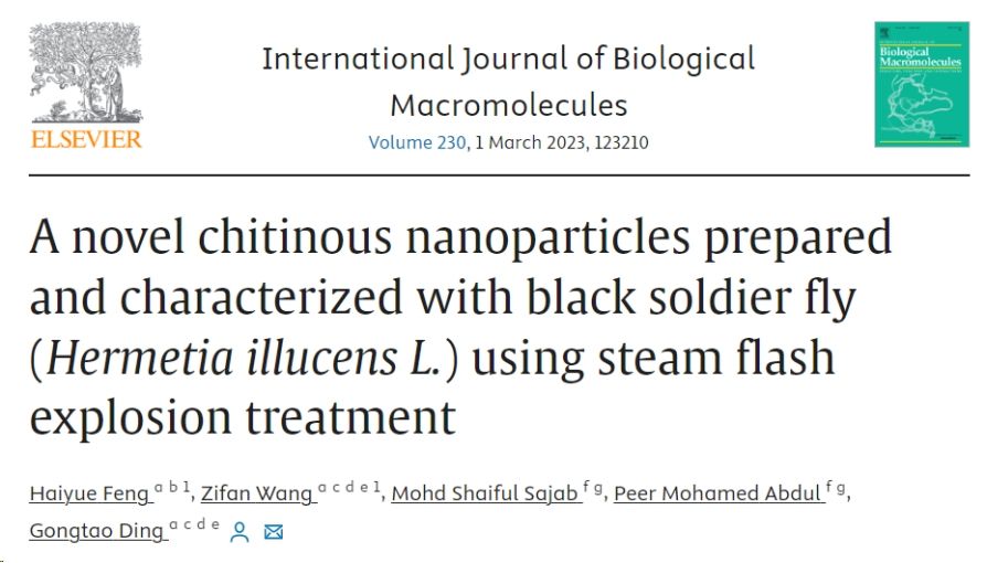 生物医学中心生物制药与材料工程创新团队在国际学术期刊International Journal of Biological Macromolecules在线发表题为“A novel chitinous nanoparticles prepared and characterized with black soldier fly (Hermetia illucens L.) using steam flash explosion treatment”的研究论文。该论文首次提出使用蒸汽闪爆装置一步制备黑水虻壳聚糖纳米颗粒的方法,为深入了解如何高效制备生物质纳米颗粒及潜在的生物质纳米递送组装系统提供新的见解。