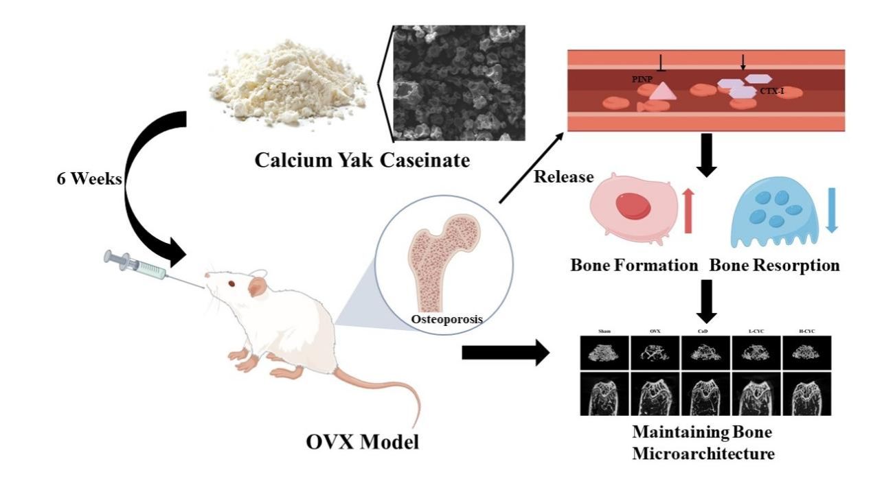 PMOP作为中老年女性群体高发的代谢性骨病,其有效防控已成为公共卫生领域的重要议题。本研究通过建立去卵巢(Ovariectomized, OVX)小鼠模型,系统评估牦牛酪蛋白酸钙(Yak casein calcium, CYC)作为新型营养补充剂对PMOP的干预效应。研究发现,补充CYC后OVX小鼠的血清钙水平明显下降,血清磷水平升高。此外,血清碱性磷酸酶(ALP)和Ⅰ型胶原羧基端肽(CTX-I)显著降低,Ⅰ型原胶原N端前肽(PINP)显著升高。以上结果表明CYC在调节骨形成和骨吸收之间的平衡、增加骨形成,减少骨吸收方面具有潜在意义。除此之外,补充CYC增加了骨小梁面积分数、骨骼肌面积分数、骨密度(BMD)、骨组织体积分数(BV/TV)和骨小梁数量(Tb.N),降低了骨骼肌纤维间距、骨小梁分离度(Tb.Sp)、骨小梁模式因子(Tb.Pf)和骨小梁结构模型指数(SMI)。研究显示出与传统钙制剂相当的骨骼保护效应,并表现出潜在的优势。研究结果不仅为开发新型钙营养补充剂提供理论依据,更为高原特色生物资源在功能性食品领域的应用开辟了新方向。