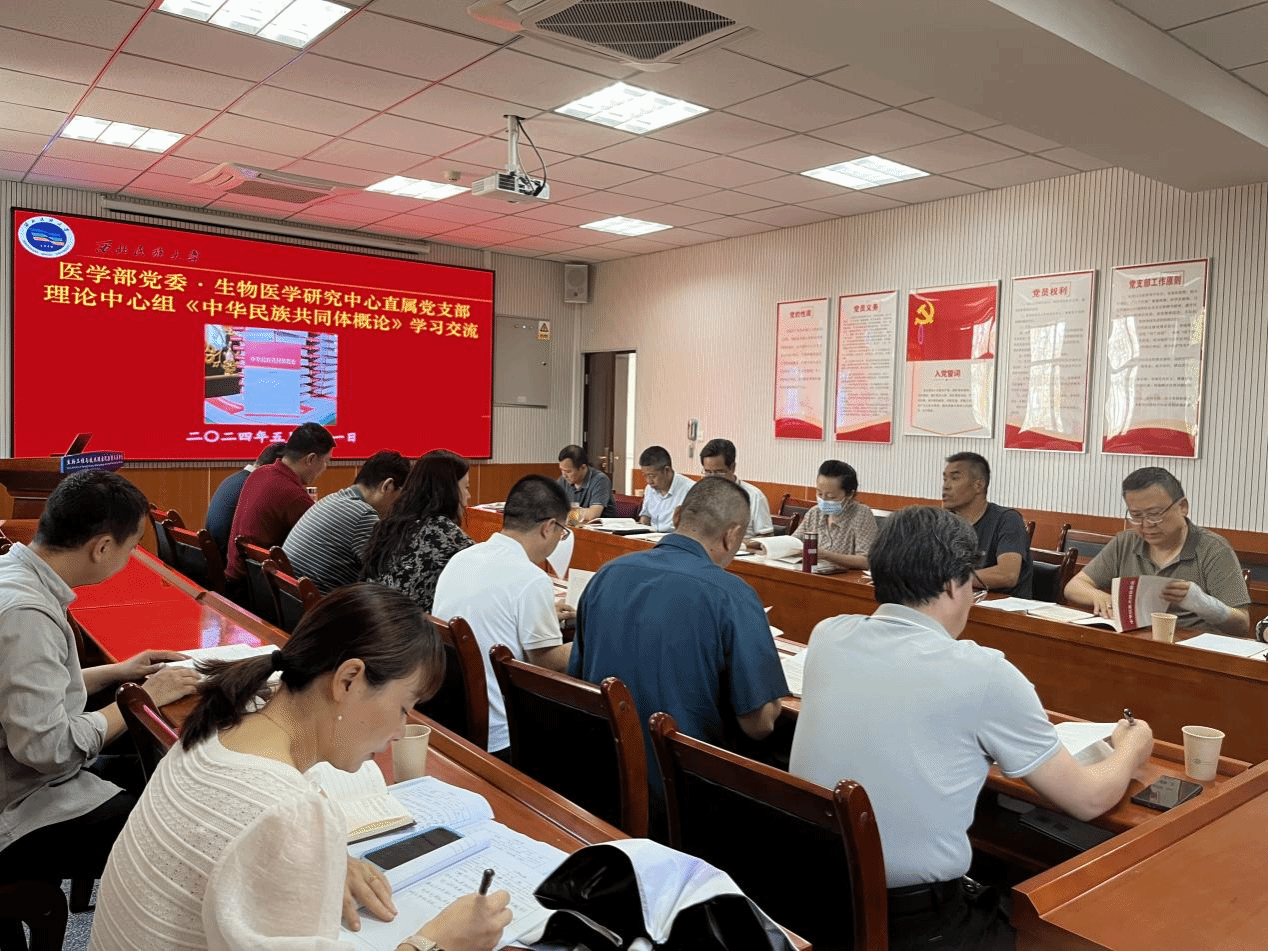 5月21日下午,生物医学研究中心直属党支部联合医学部党委理论学习中心组,在生物工程楼二楼会议室召开理论学习中心组专题联学会议,深入学习《中华民族共同体概论》教材,并结合实际工作进行了交流讨论。医学部党委书记郭力主持联学。