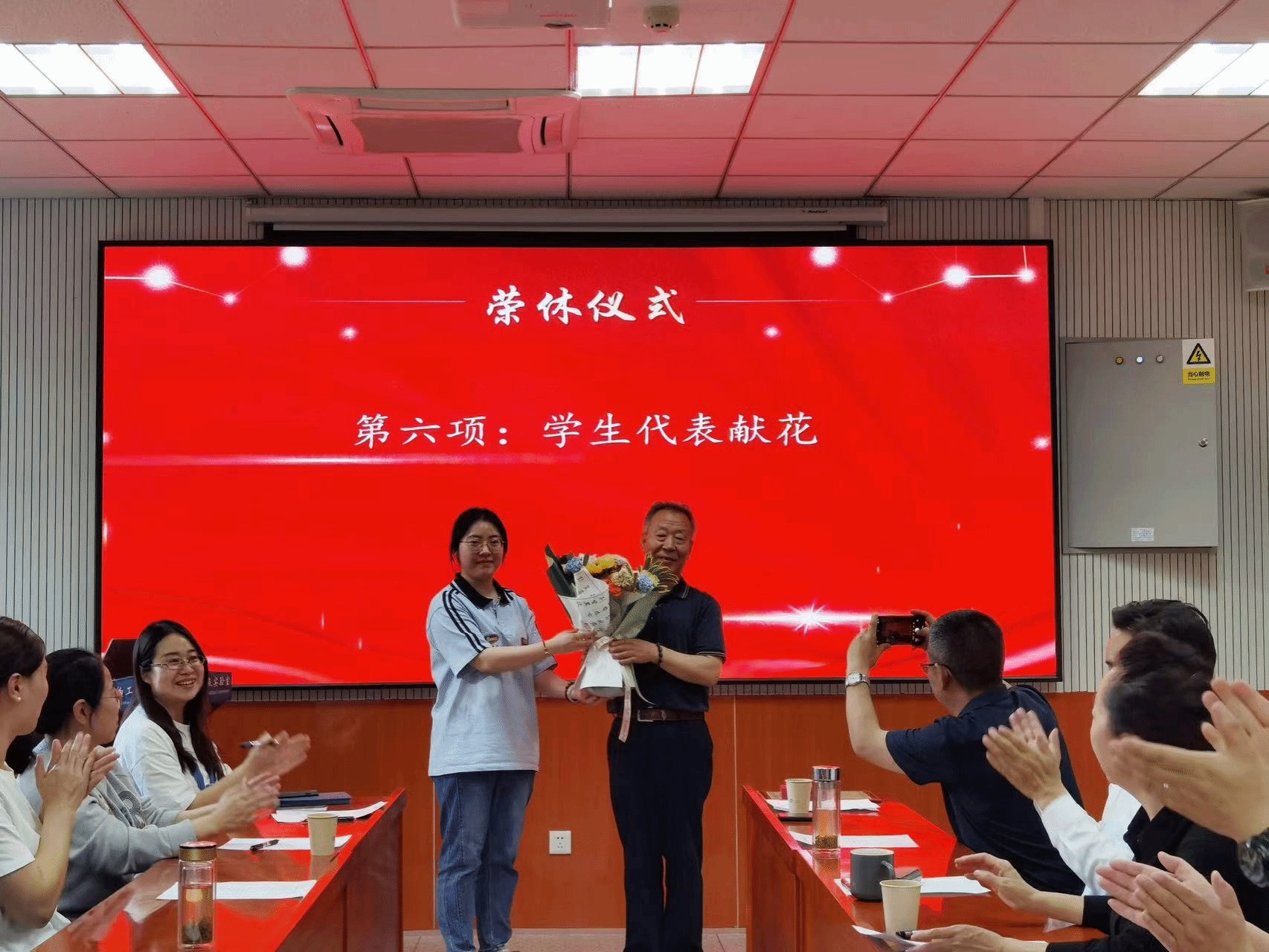 离退休工作处安永国书记、中心直属党支部哈玉梅书记为令世鑫老师颁发纪念章、荣誉证书,学生代表献上鲜花。