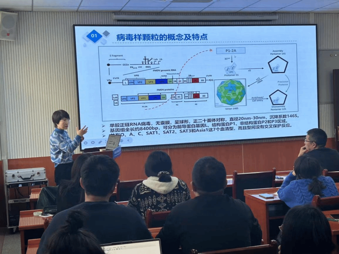 郭慧琛研究员在学术报告中介绍了病毒样颗粒的特征、优势、制备方法及应用场景,并以口蹄疫病毒颗粒样疫苗的开发为例,深度解析了病毒样颗粒制备的理论基础、耐热性筛选和钙化修饰等,同时郭慧琛研究员还介绍了其科研团队的党建、团队文化建设与科研业务融合的基本情况。