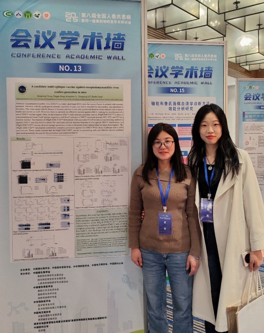 2025年4月25日-28日,由中国微生物学会、中国畜牧兽医学会、中华预防医学会、中国地方病协会和中国药科大学共同主办的第八届全国人兽共患病暨同一健康药物研发学术研讨会在南京召开。生物医学研究中心病原感染机制与CHO表达创建团队青年教师李向茸、李慧霞、李莎莎、苏碧秀带领研究生参加会议并做壁报展示。