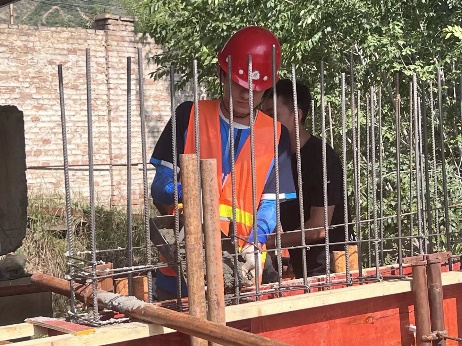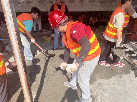 最令人振奋的是同学们自己动手,主导完成了混凝土结构模型的梁、板、柱、墙主体结构的钢筋绑扎、模板支设和混凝土浇筑工作。从识图放线开始,到钢筋下料、绑扎成型,再到模板拼装、加固校准,最后是混凝土的搅拌、运输、振捣、抹平养护,每一个环节都凝聚着同学们的心血与汗水。烈日下,他们细致地绑扎每一根钢筋;模板前,他们反复校准确保尺寸精确;振捣棒轰鸣声中,他们专注地保证混凝土密实。当一簸箕一簸箕,一铁锹一铁锹的混凝土最终凝结成坚固的构件,同学们真正触摸到了建筑的“筋骨”,也深刻理解了“匠心”二字的千钧重量。