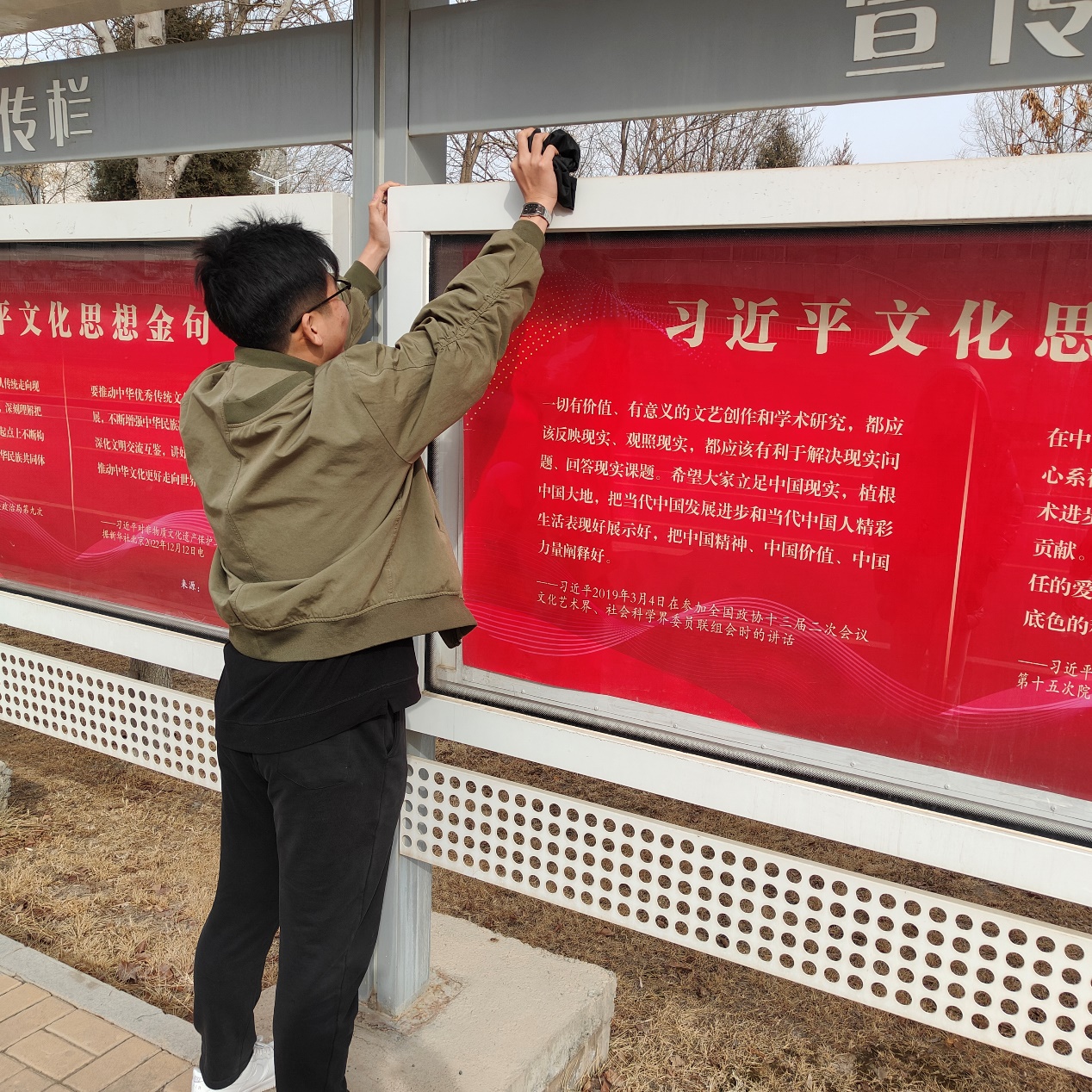 同时,志愿者们还对宣传栏进行了清理和维护。他们小心翼翼地擦拭着宣传栏的玻璃和边框,清除了积累已久的灰尘和污垢。经过一番精心打理,宣传栏熠熠生辉,再次成为校园内一道亮丽的风景线。