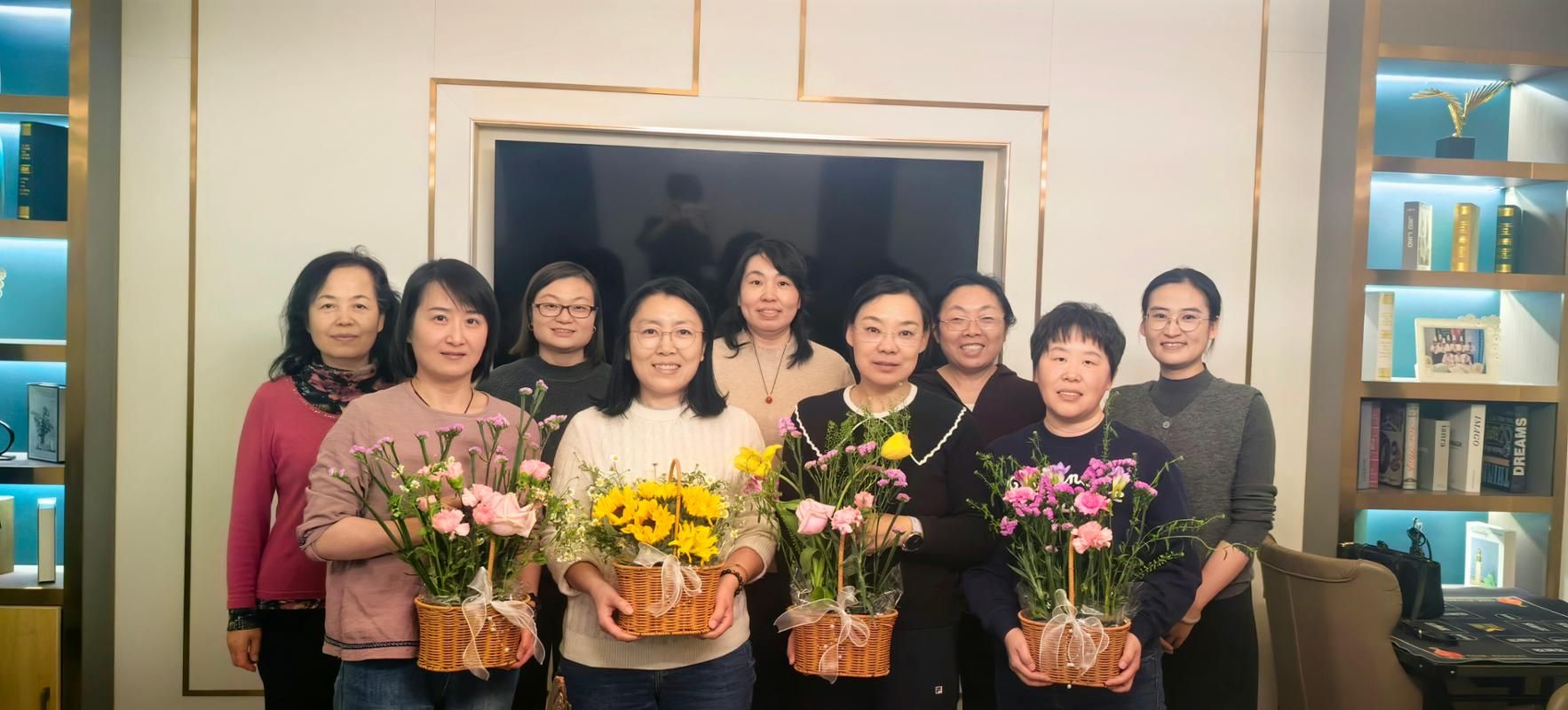 作品完成后,老师们将花艺作品集中展示,相互欣赏交流,现场定格合影留念。