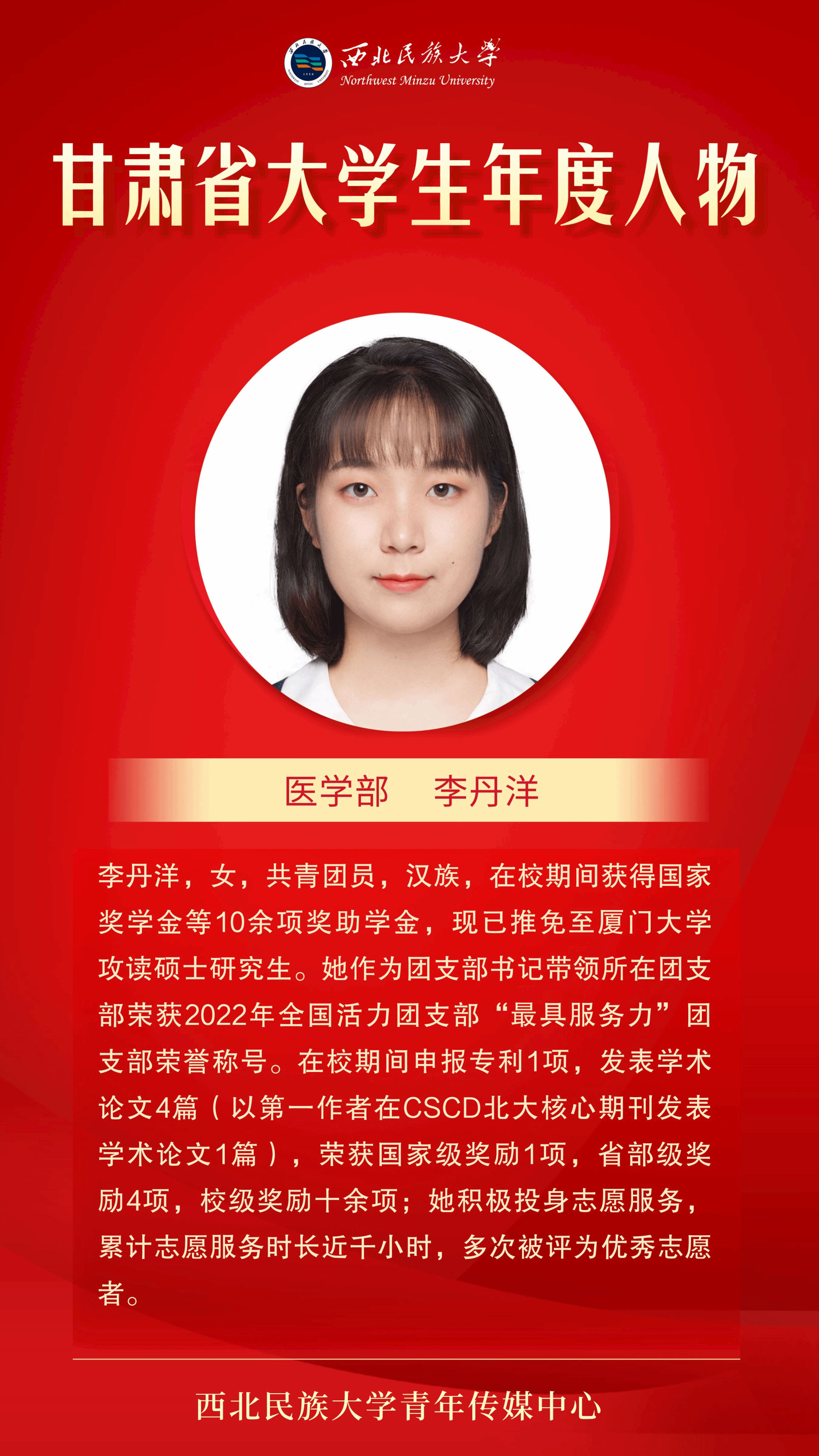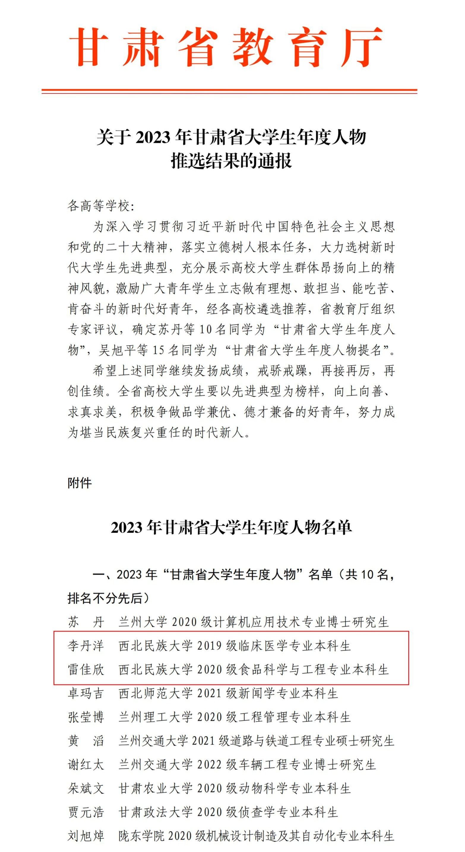 审核、推荐,省教育厅组织专家评审等环节,李丹洋、雷佳欣同学从众多评选对象中脱颖而出,荣获2023年“甘肃省大学生年度人物”。李丹洋同学已被甘肃省推报参评“全国大学生年度人物”。