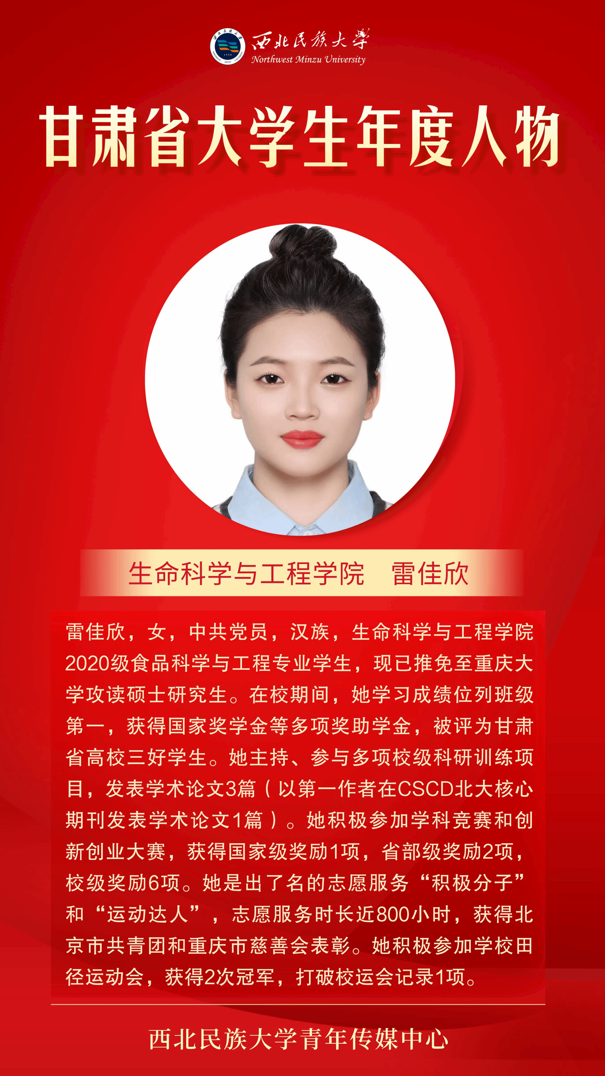 雷佳欣同学获此殊荣。据悉,本年度全省共评选出“甘肃省大学生年度人物”10名,提名奖15名。