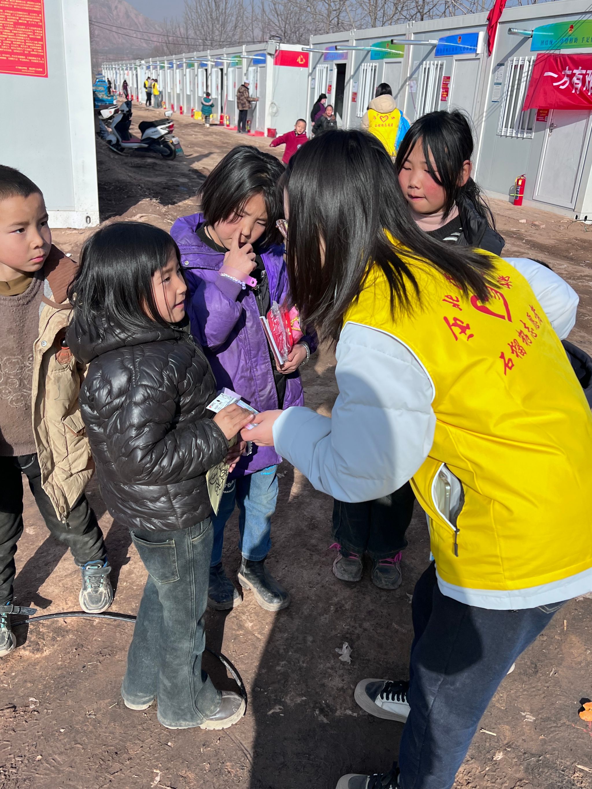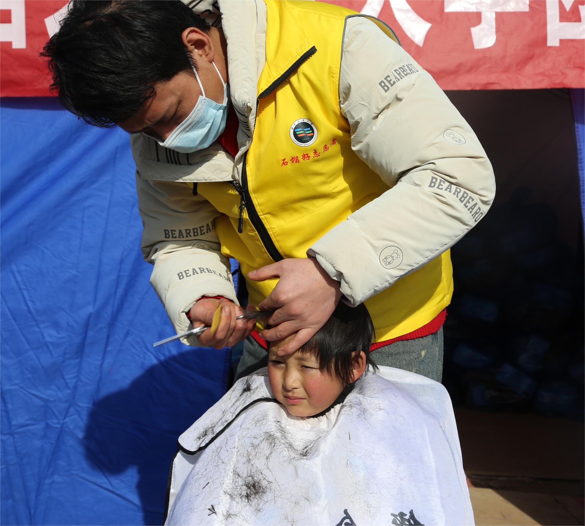 的师生开展了心理和情绪疏导、社区关怀服务、儿童及老人关爱服务工作。后勤集团选派理发师王飞抵达现场后就马不停蹄地为群众剪起了头发,当问他累不累的时候,他笑着说到,“不累,新年新气象,让群众在新年第一天有一个新面貌,感觉特别开心和满足”。学生志愿者张雪说:“得知选拔志愿者的消息后,我第一时间就报了名,非常荣幸能参与其中,虽然自己的力量有限,但是能为灾区贡献自己的一份力量,是自己最好的元旦礼物”。