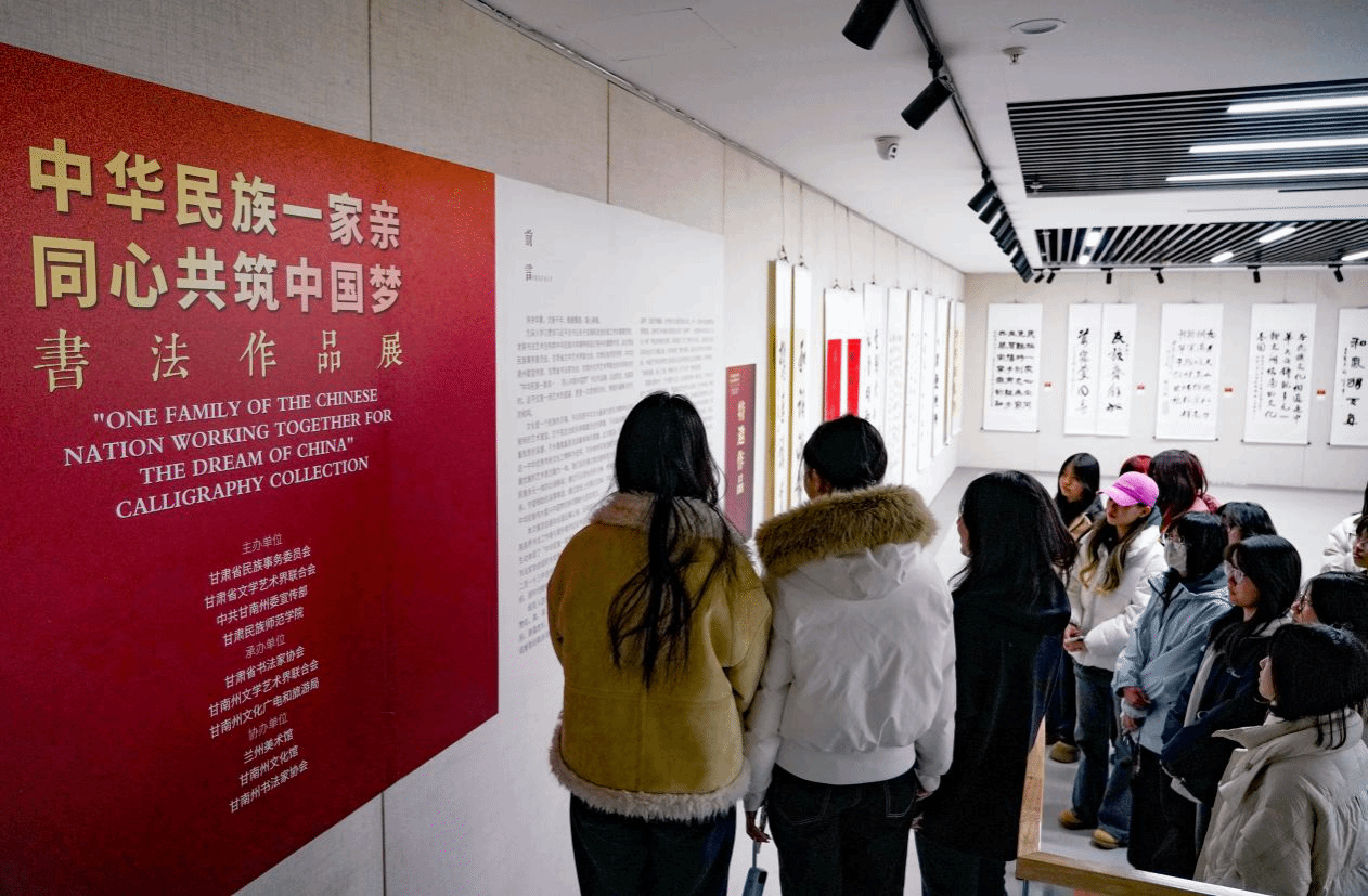 展览现场,一幅幅主题鲜明、笔墨精良的书法作品,呈现了各民族交往交流交融的历史脉络,传递了“中华民族一家亲”的深厚情感。学生们驻足欣赏,细细品味作品蕴含的文化内涵与家国情怀,感受书法艺术的独特魅力,进一步深化了对中华民族共同体的认知与认同。