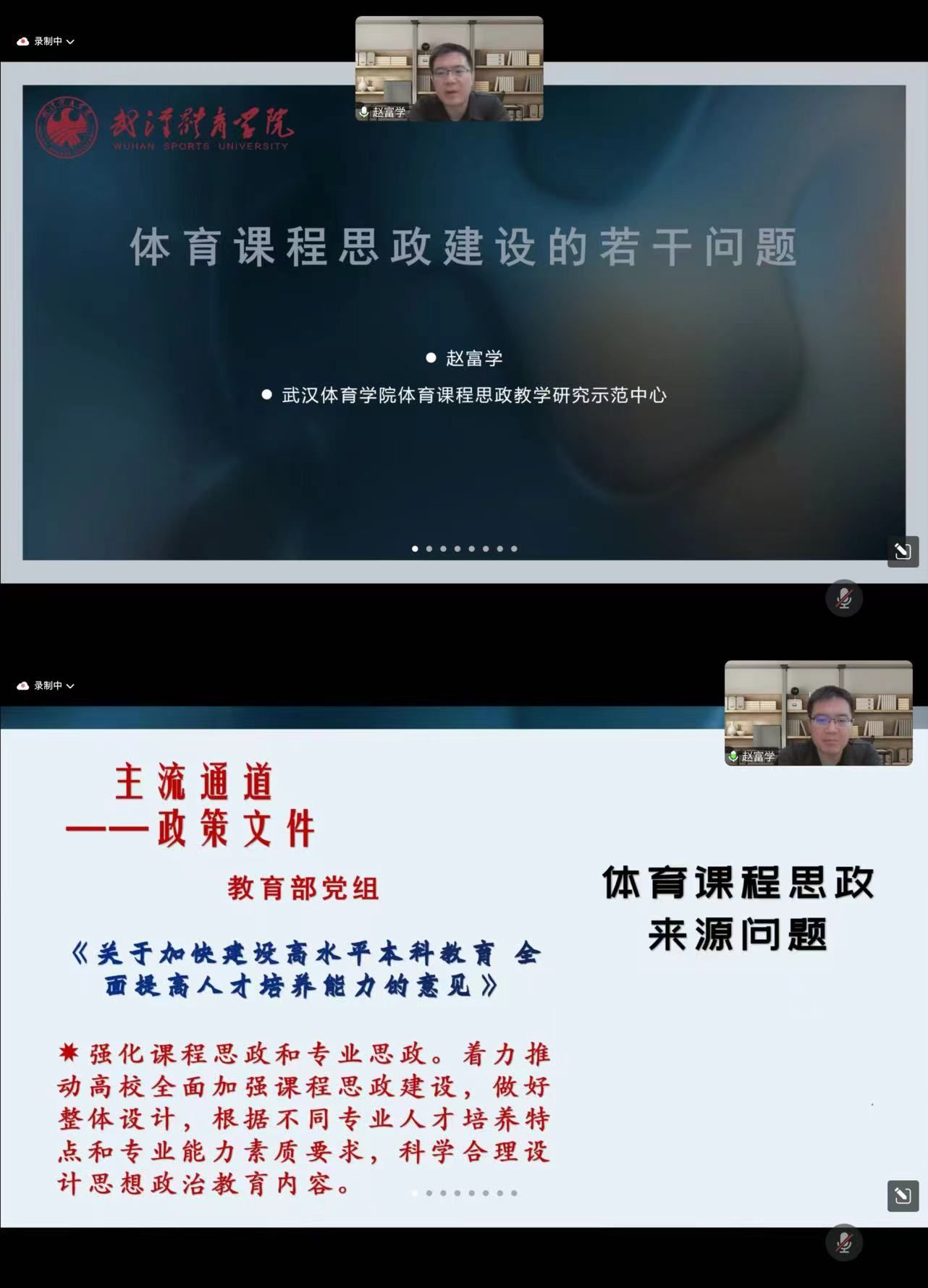 教授、博士生导师赵富学以“体育课程思政建设的若干问题”为主题做了专题讲座,讲座以线上形式进行,全院教职工及全体研究生近200人参加,副院长朱惠平主持讲座。