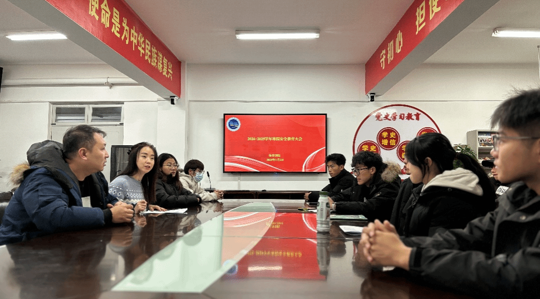 全体班长进行集中安全教育动员宣传,对返乡交通出行注意事项、假期人身安全、意识形态安全、寝室消防安全、防范电信诈骗等方面作了详细的讲解,将各类安全知识清晰地传达给每一位同学;会上,还通报了近期学生晚归情况,对离校申请的流程和注意事项做了说明,再次强调了期末考试期间诚信考风考纪。