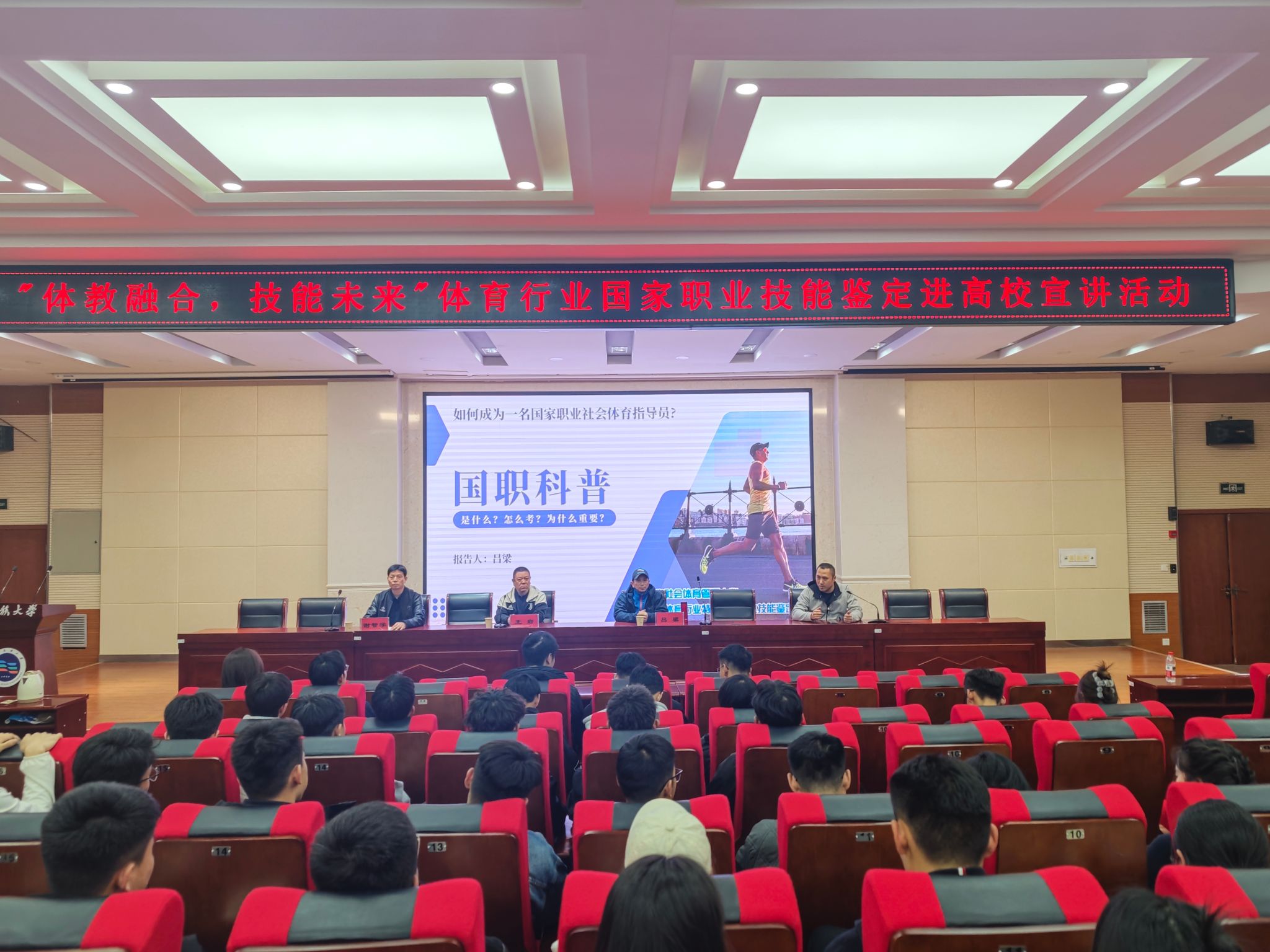 研究生及本科生开展。宣讲过程中,吕梁凭借其深厚的专业知识和丰富的行业经验,深入浅出地帮助学生了解体育行业职业技能,为同学们拓宽就业渠道、提升就业竞争力指明了方向。他详细解读滑雪、游泳、攀岩等多个朝阳行业国家职业社会体育指导员的培养路径,为同学们提供多元化可量化职业发展方案。