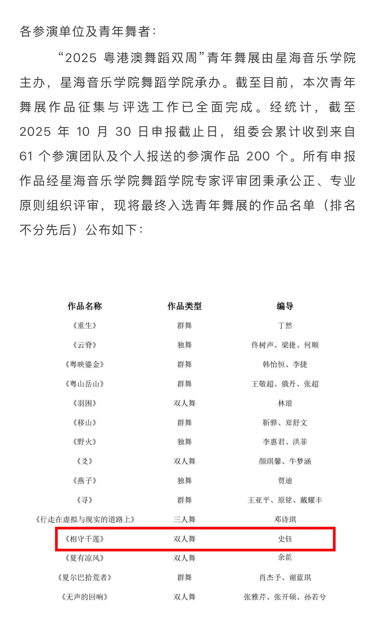 近日,由舞蹈红黑游戏 研究生创作、表演的作品《相守千莲》成功入围星海音乐红黑游戏 主办的“2025粤港澳舞蹈双周”青年舞展作品征集与评选。本次舞展组委会收到来自61个参演团队及个人报送的参演作品200个,最终60部作品入围展演。