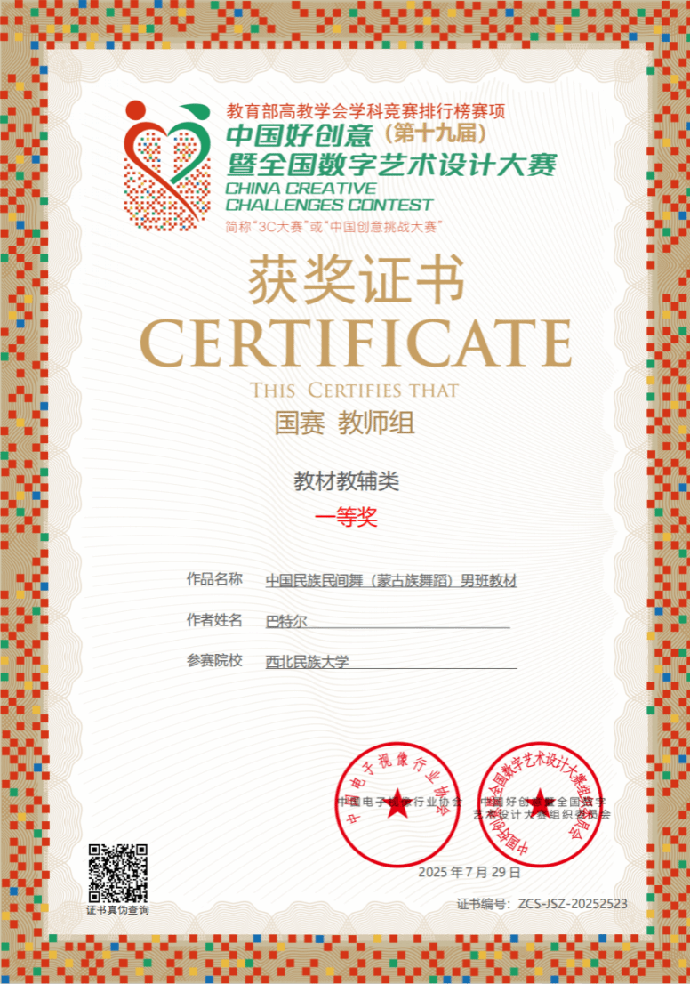 中国好创意暨全国数字艺术设计大赛是教育部高等教育学会学科竞赛排行榜内重点赛项,赛事覆盖全国高校师生,以专业性、权威性和创新性著称,是检验高校教学成果与教师科研能力的重要平台。巴特尔编写的《中国民族民间舞(蒙古族舞蹈)男班教材》,立足民族舞蹈的文化根源与艺术特质,打破传统教材的单一性,通过数字化教学资源拓展了教学场景,为民族舞蹈人才培养提供了全新的教学范式。