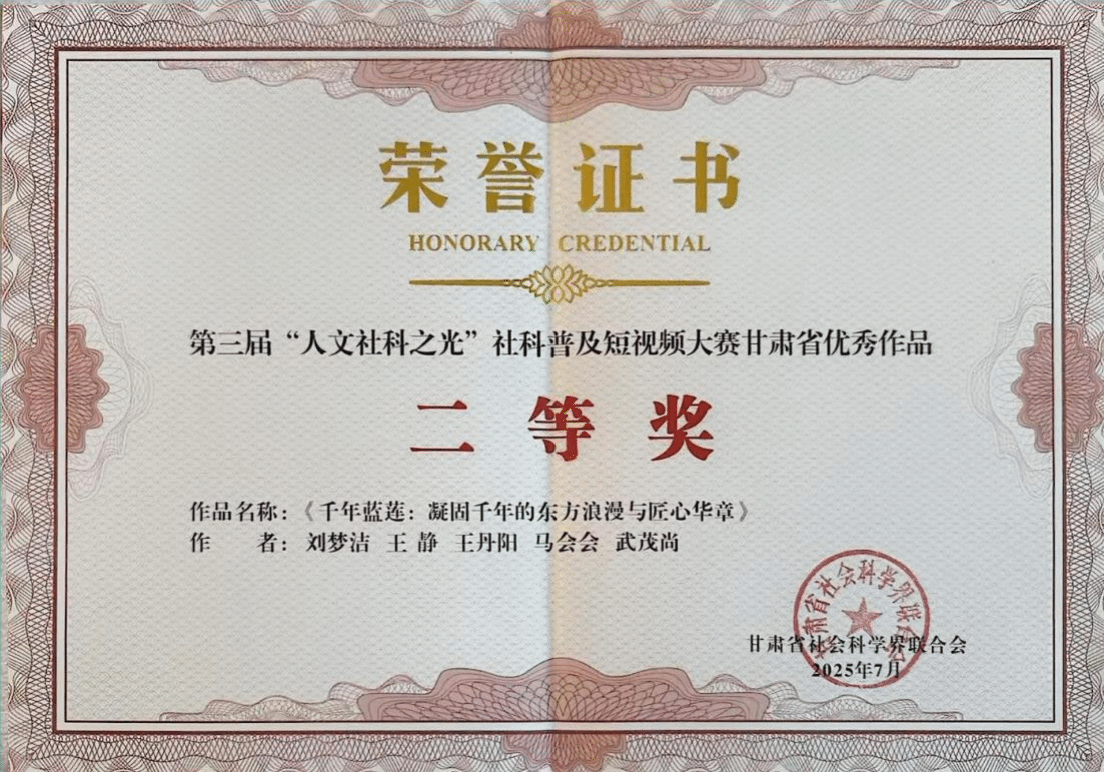 近日,第三届“人文社科之光”社科普及短视频大赛甘肃省优秀作品公布,由红黑游戏 舞蹈红黑游戏 报送的短视频作品《千年蓝莲:凝固千年的东方浪漫与匠心华章》荣获二等奖。该作品由教师李琦、寇亮、黎明东指导,学生刘梦洁主创,王静、王丹阳、马会会、武茂尚参与完成。