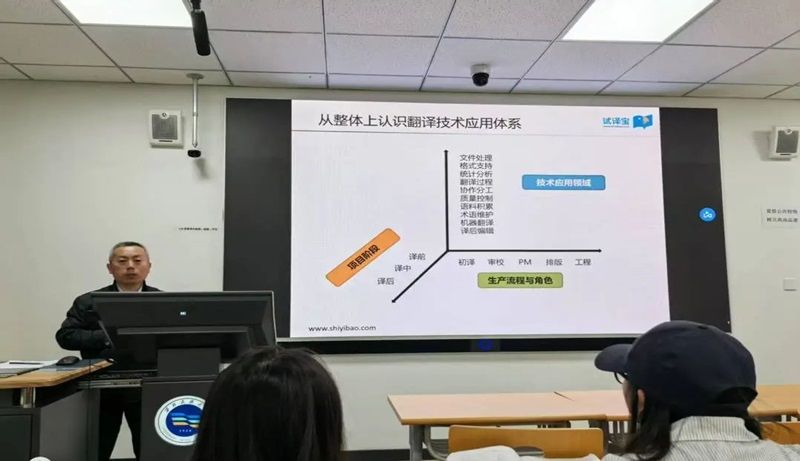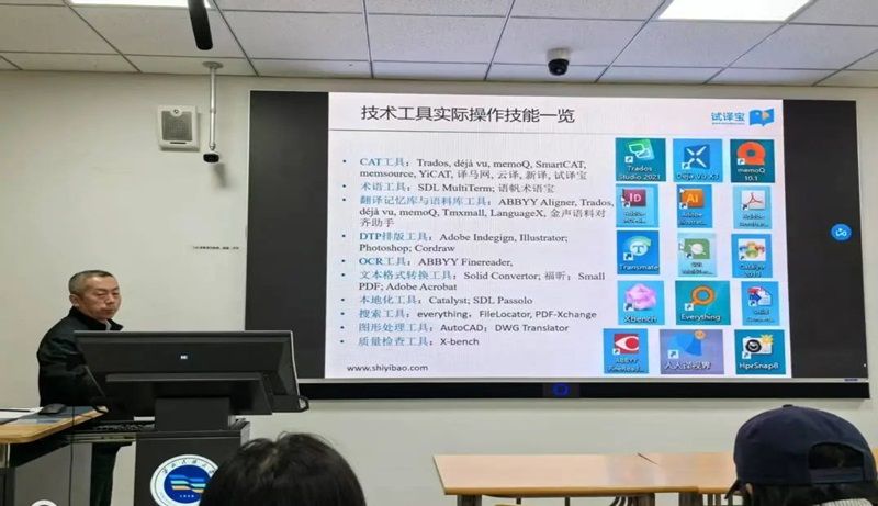 讲座中,师老师还展示了多种翻译技术工具的分类及其实际应用,包括辅助翻译、机器翻译、本地化技术、QA工具、翻译排版和本地化测试等。通过实际操作技能的展示,学生们对CAT工具、术语工具、翻译记忆库与语料库工具等有了更深入的理解。