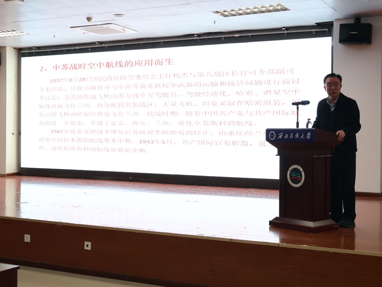 讲座开始,袁志学老师围绕抗日战争时期西北国际交通线构建主题深入分享,一段尘封的激情历史随之揭开。同学们深切感受到,风雨飘摇的年代里,先辈凭智慧与勇气铸就“生命通道”的辉煌,领悟其中深厚的家国情怀。袁老师细致讲述了这条以西安、兰州、乌鲁木齐为核心的交通动脉:八路军办事处构建“点线联动”网络,陕办聚焦人员转移与线路畅通,甘办协调物资运输与统战发展,新疆办则作为内外连接“桥头堡”,推动边疆建设并促进内外交流;甘新公路以“先行后建”策略突破日军封锁,成为连接苏联与中国大后方的“陆上生命线”,让兰州成为战略重镇;中苏“军民合体”共建空中航线,10个机场与航空基地构成立体运输网络,为欧亚空运奠基;同时,无线电通讯系统同步完善,中苏特种情报技术合作所及各地情报站点有效运作,为抗战战略决策提供坚实情报支撑。