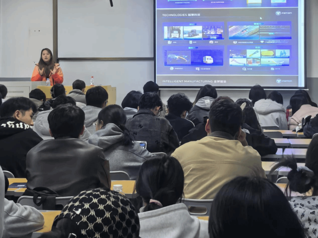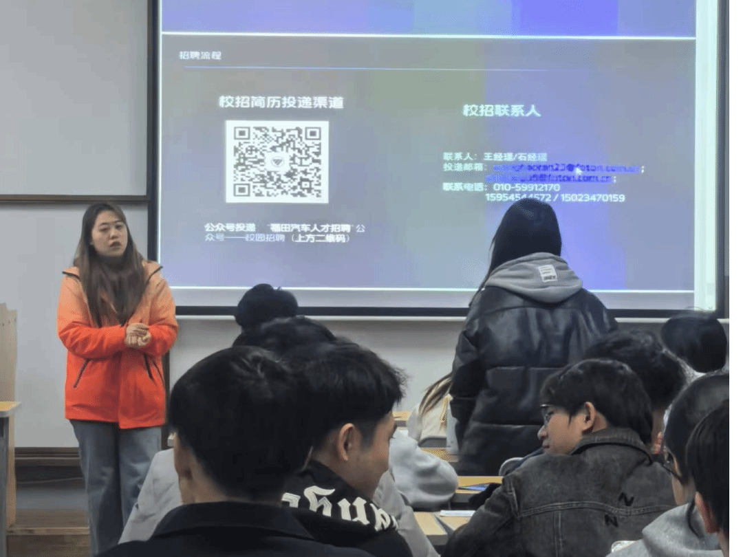 当日14:30,宣讲会正式启动,吸引众多毕业生到场。北汽福田HR 团队通过视频展示、现场讲解及互动问答,详细介绍企业全球布局、岗位职责、职业发展路径与薪资福利,重点聚焦海外业务发展机会,特别强调小语种专业人才的需求与优势。