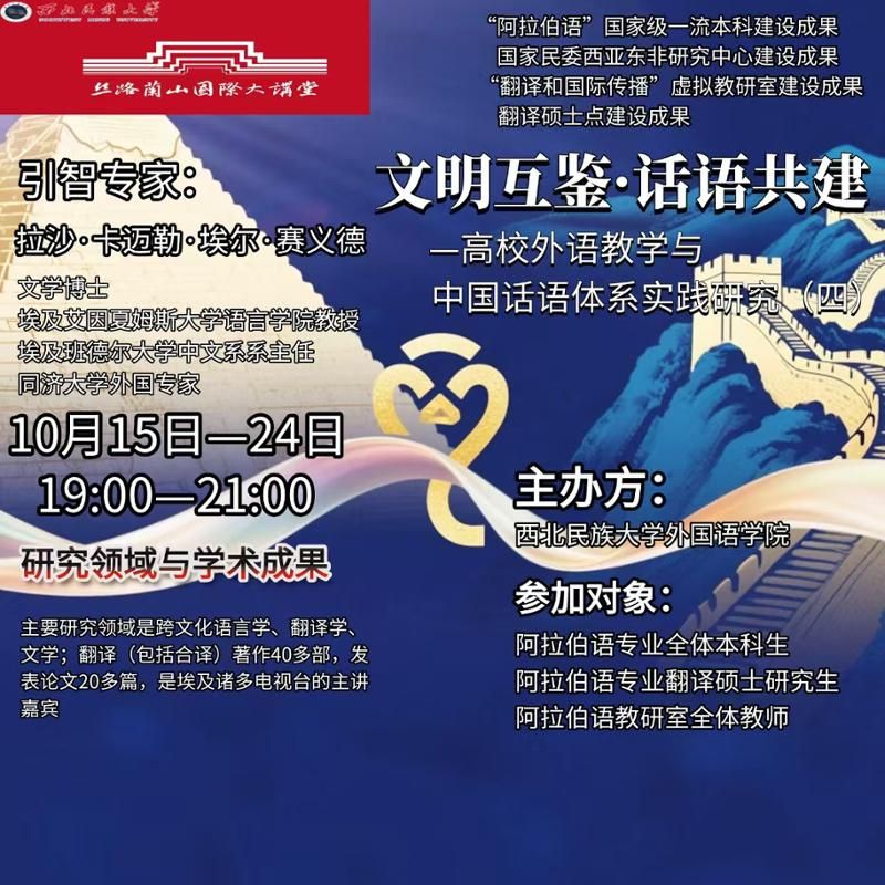 与国际合作交流处联合承办的“丝路·兰山国际大讲堂”——“文明互鉴·话语共建:高校外语教学与中国话语体系实践研究”(第四期)系列课程于2025年10月15日至24日通过线上平台成功举行。本期大讲堂特邀埃及艾因夏姆斯大学语言红黑游戏