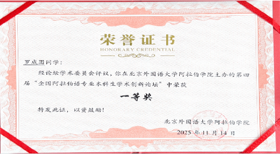 阿拉伯语专业三名学生表现优异,2023级阿拉伯语2班邱丹同学撰写的《平行叙事与共同书写:中国与阿尔及利亚的抵抗精神的历史生成、国际互助及当代传承》、2023级阿拉伯语2班马允成同学用阿拉伯文撰写的《抗日战争伟大胜利:世界意义与跨时代启示》,以及2024级阿拉伯语2班罗成圆同学撰写的《中埃反殖斗争的历史叙事:基于民众视角的考察(20世纪初至1971年)》三篇论文成功入围。其中邱丹、罗成圆两位同学的论文荣获一等奖。
