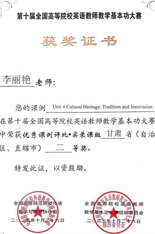 李丽艳老师获优秀课例评比·实录课组甘肃省二等奖。