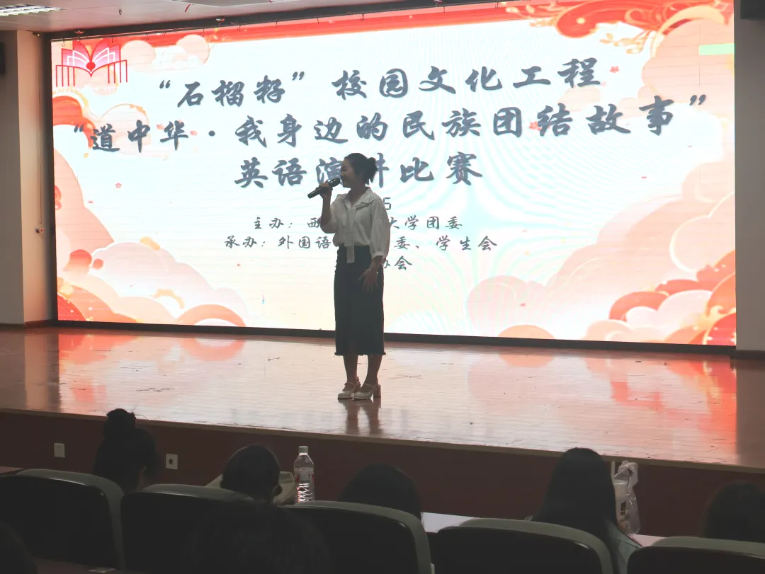 比赛现场气氛热烈,选手们用流利的英语和真挚的情感,讲述了一个个感人至深的民族团结故事。他们从身边的小事入手,生动展现了各民族同学在学习、生活中的相互帮助与支持,诠释了中华民族大家庭中各民族“像石榴籽一样紧紧抱在一起”的深厚情谊。选手们精彩的演讲不仅展示了他们的英语表达能力,更传递了民族团结的正能量,赢得了现场观众的阵阵掌声。