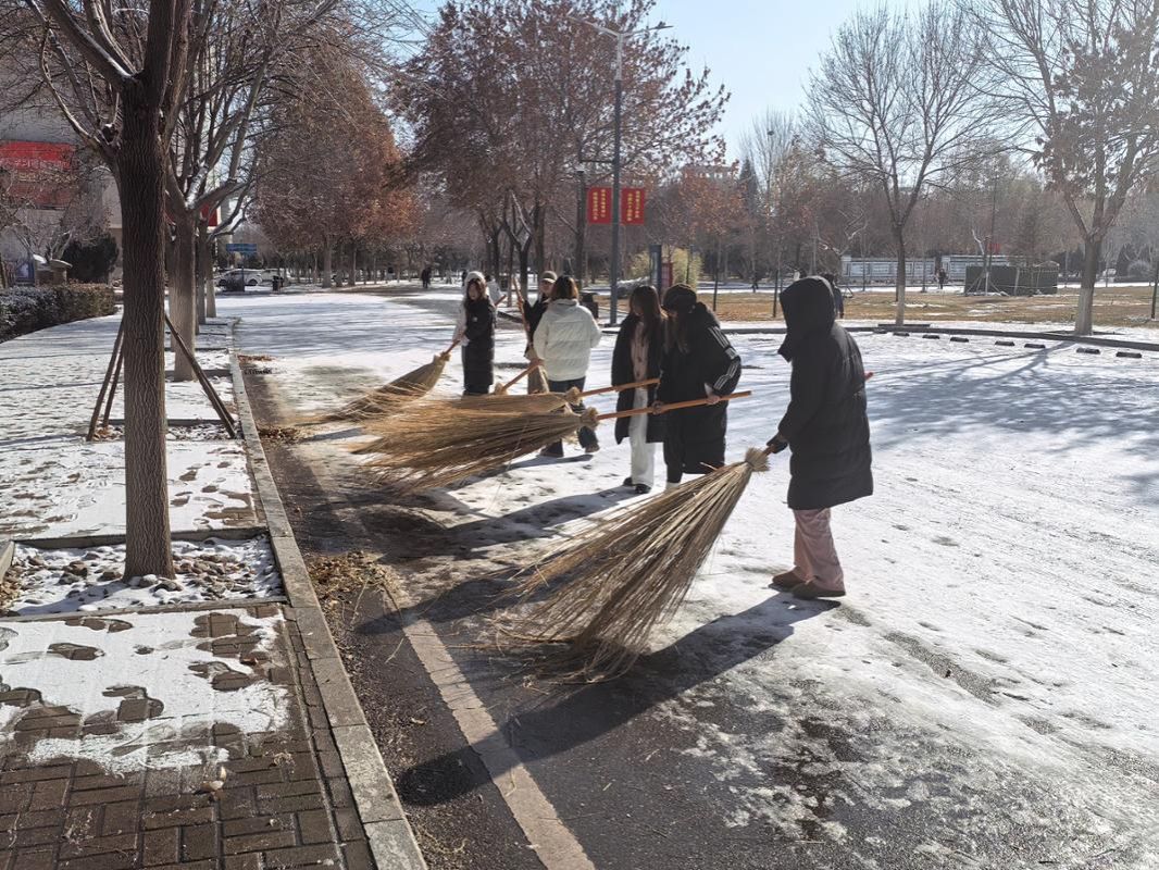 提前划分清扫区域、合理调配人员,统一发放铁锹、雪推板、扫帚等工具。劳动现场,同学们迅速组建清雪小队,分工协作、干劲十足;有的挥锹铲雪,有的推雪成堆,有的扫帚收尾,即便双手冻得通红,也始终保持着饱满热情。经过共同努力,校园内积雪覆盖的道路、广场很快恢复整洁通畅,为全校师生的安全出行提供了坚实保障。