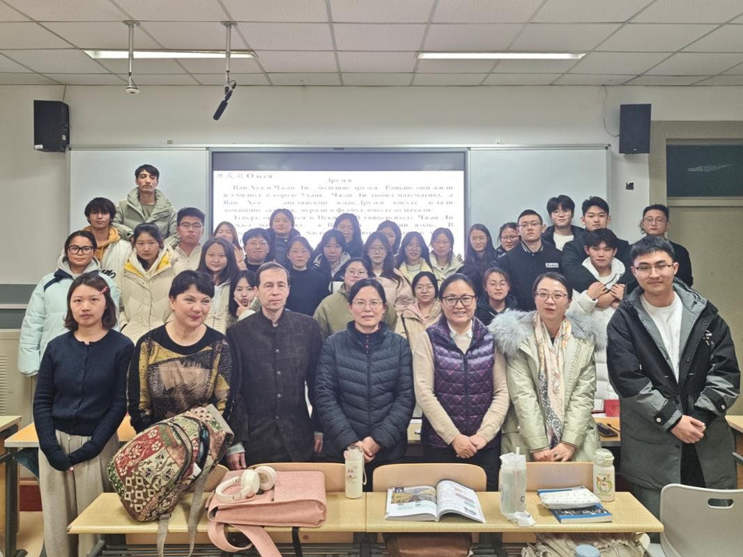 俄语协会在致美楼251教室举办“俄韵墨舞,语妙声华”俄语语音书法大赛。比赛邀请俄语外教Олег А.В.与其夫人Ирина П.В.、俄语教研组周红梅、李青洁、张娟、初明磊等几位老师以及学生代表杨浩、苑佳琪共同担任评委。