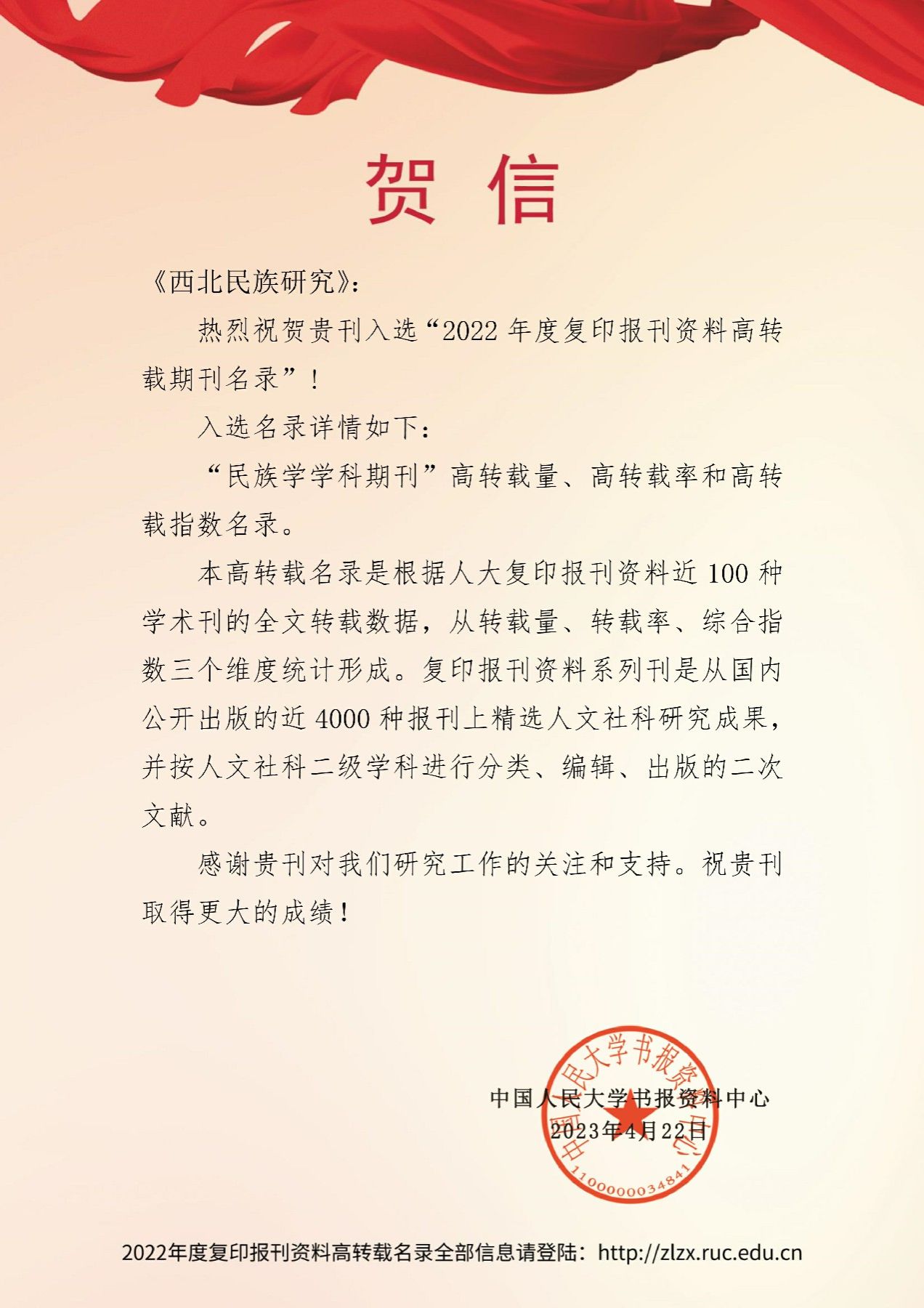 《西北民族研究》获“2022年度复印报刊资料高转载期刊名录”