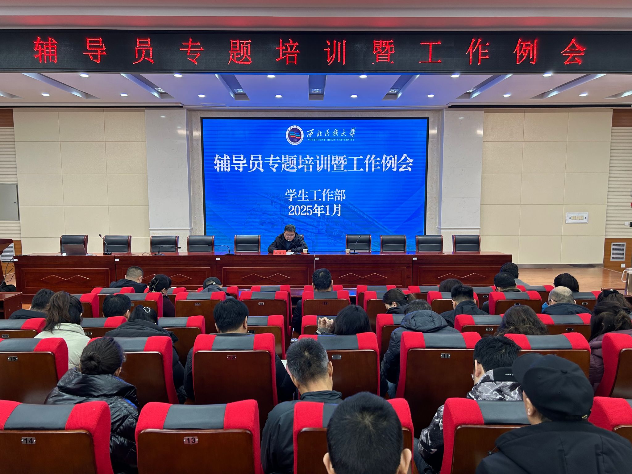 培训结束后,全体辅导员召开了本学期最后一次工作例会。会议对近期的工作进行了总结,传达贯彻���实国家民委关于寒假前后相关工作要求通知和学校第四次学生工作例会精神,进一步统一思想、凝聚共识,持续加强学生工作队伍建设,安排部署近期学生工作,确保寒假前后学生工作平稳有序,以优异成绩向学校第七次党代会献礼。会议由学生工作部部长刘曜主持。