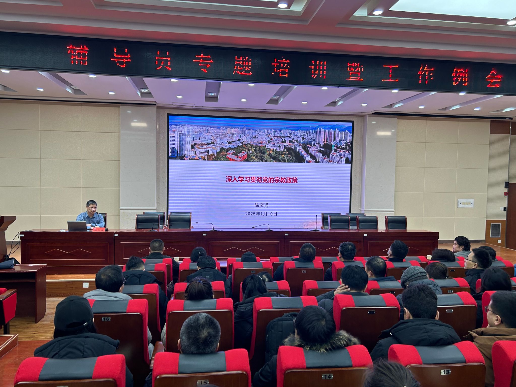 陈彦通以《深入学习贯彻党的宗教政策》为题,重点宣讲了新时代党的民族宗教工作理论和方针政策、法律法规,系统论述了习近平总书记关于加强和改进民族工作的���要思想,立足高校落实立德树人根本任务,结合案例,讲述了如何让学生树立马克思主义民族观、宗教观。本次专题培训将宗教工作政策理论与实际工作相结合,既有理论深度、也有格局高度、更有实践广度,为辅导员工作提供了方向引领和方法指导。